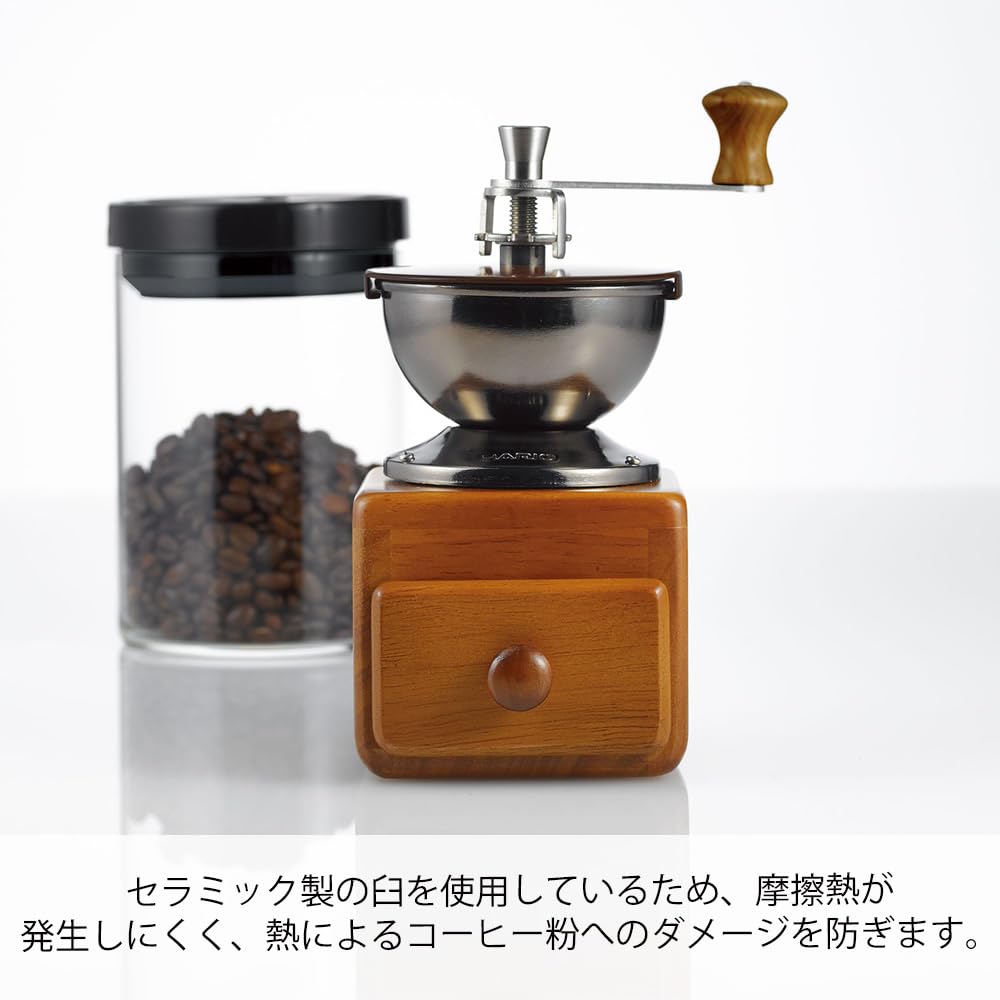 セラミック製の臼を使用しているため、摩擦熱が発生しにくく、熱によるコーヒー粉へのダメージを防ぎます。豆を入れるホッパー部にはスライド開閉式のフタが付いています。