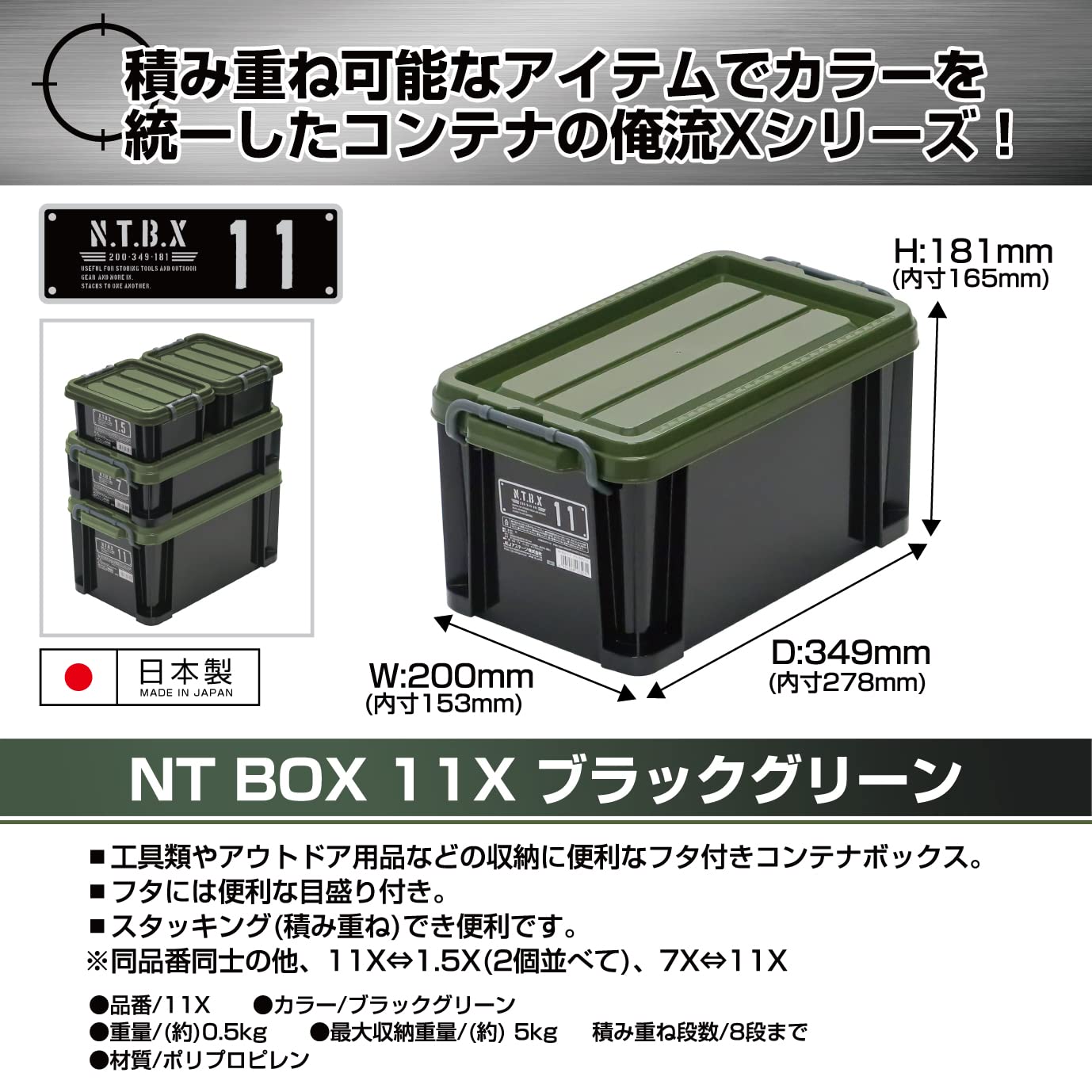 JEJアステージ(JEJ Astage) 収納ボックス [Xシリーズ NTボックス #11] ブラックグリーン 防災 幅20×奥行34×高さ18cm 日本製 積み重ね