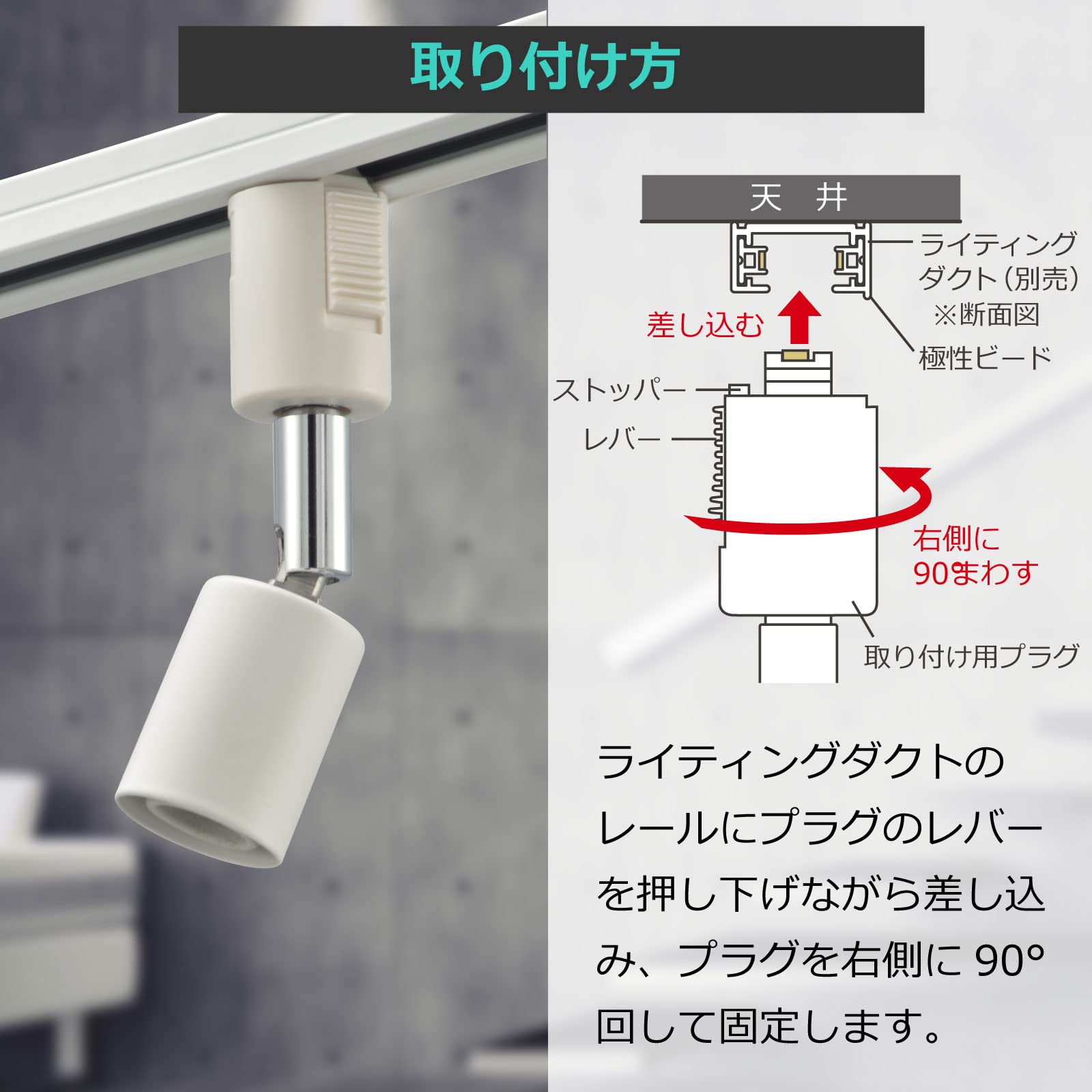 【 特 長 】● ライティングダクト(別売)に簡単に取り付けできます● ライトの向きを自由に動かせます● E17口金● 電球別売(白熱球100W、LED電球12Wまで)● 本体カラーはホワイト● 屋内用