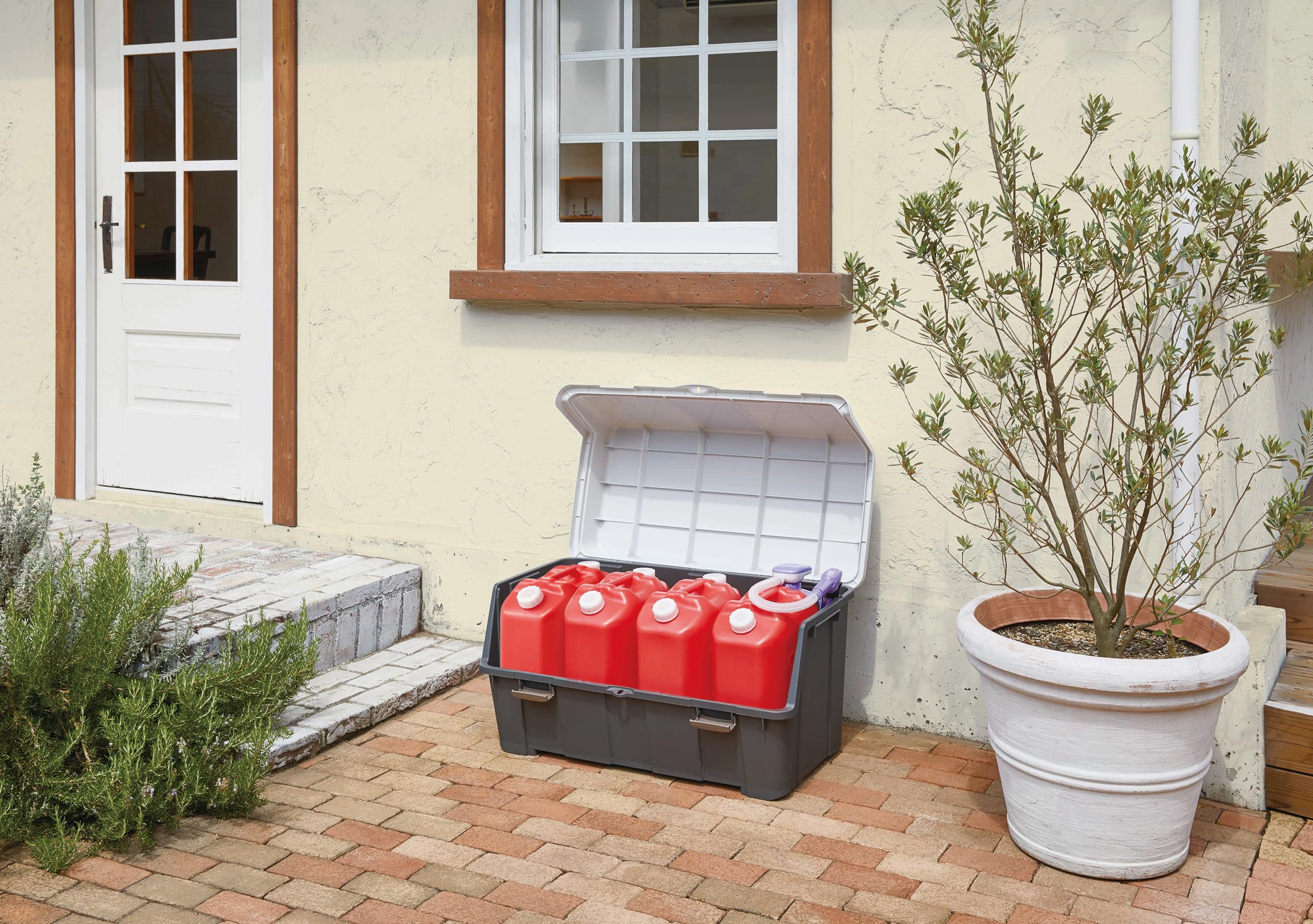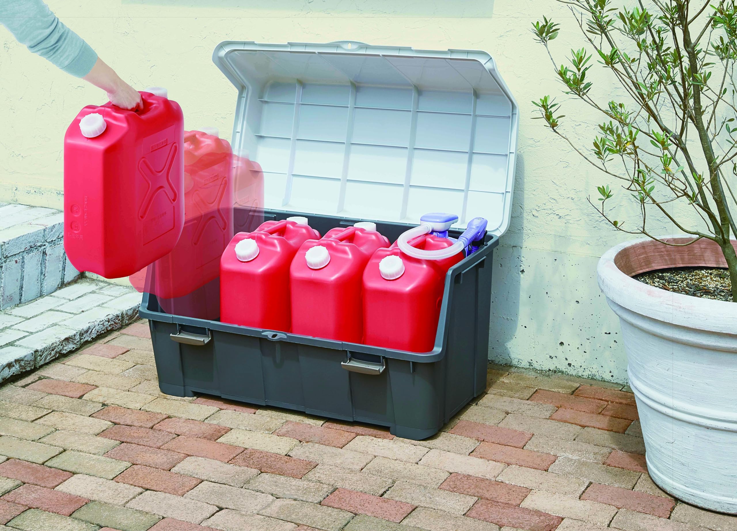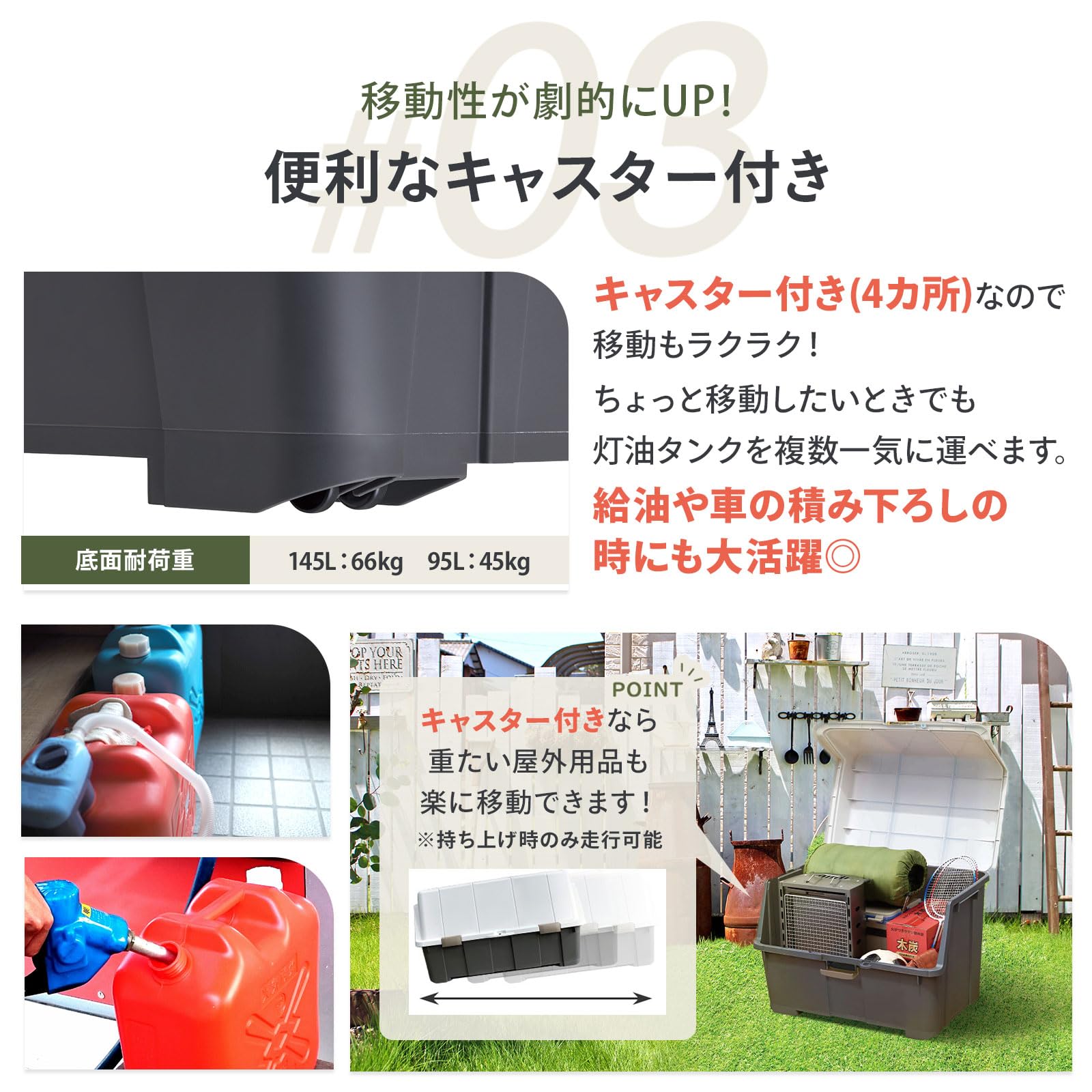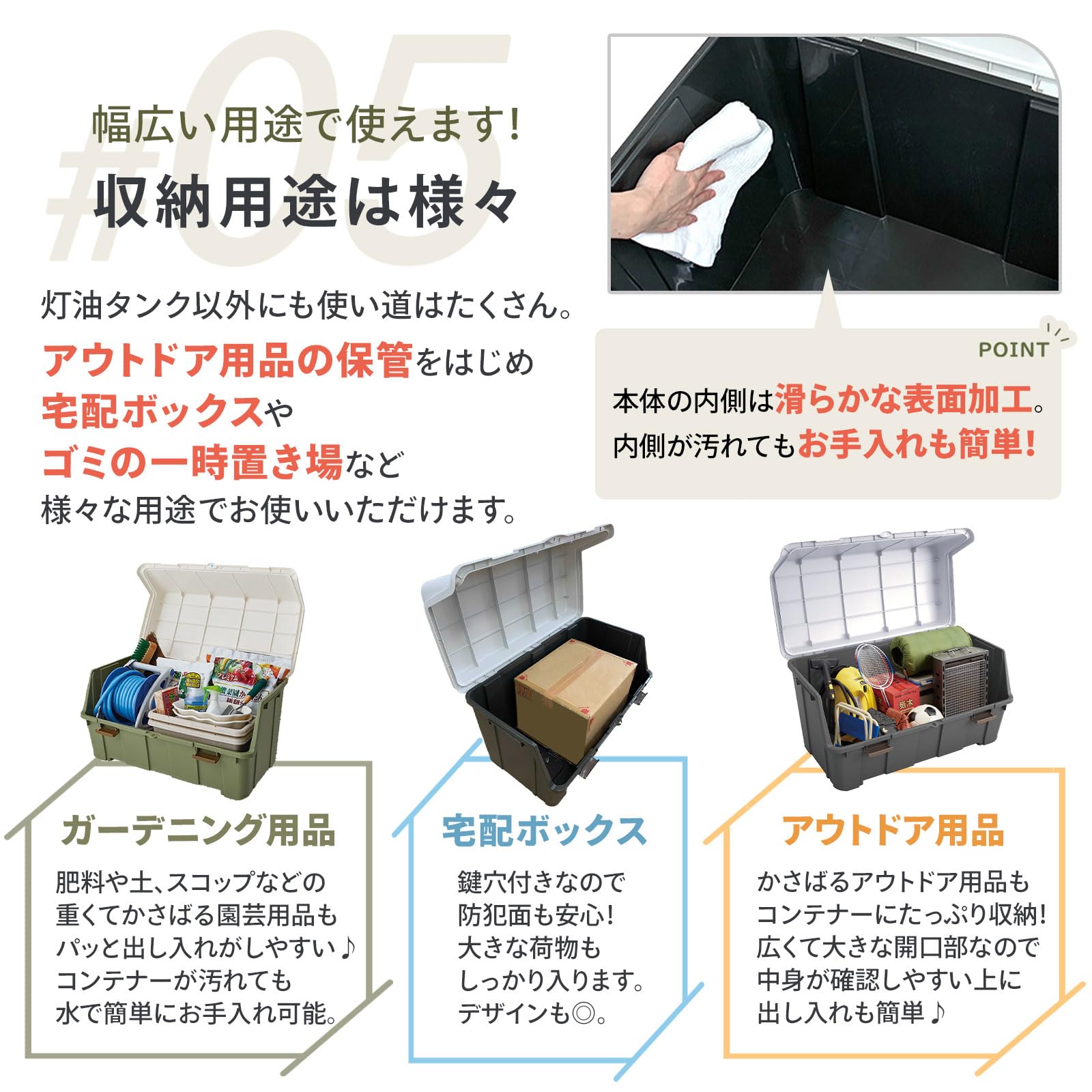 容量140Lのコンテナー(ストッカー)。18Lの灯油缶なら4個、20Lの灯油缶なら3個収納可能。重い物でも取り出しやすく、市販の南京錠が付けられる鍵穴付きで、防犯対策もバッチリです。