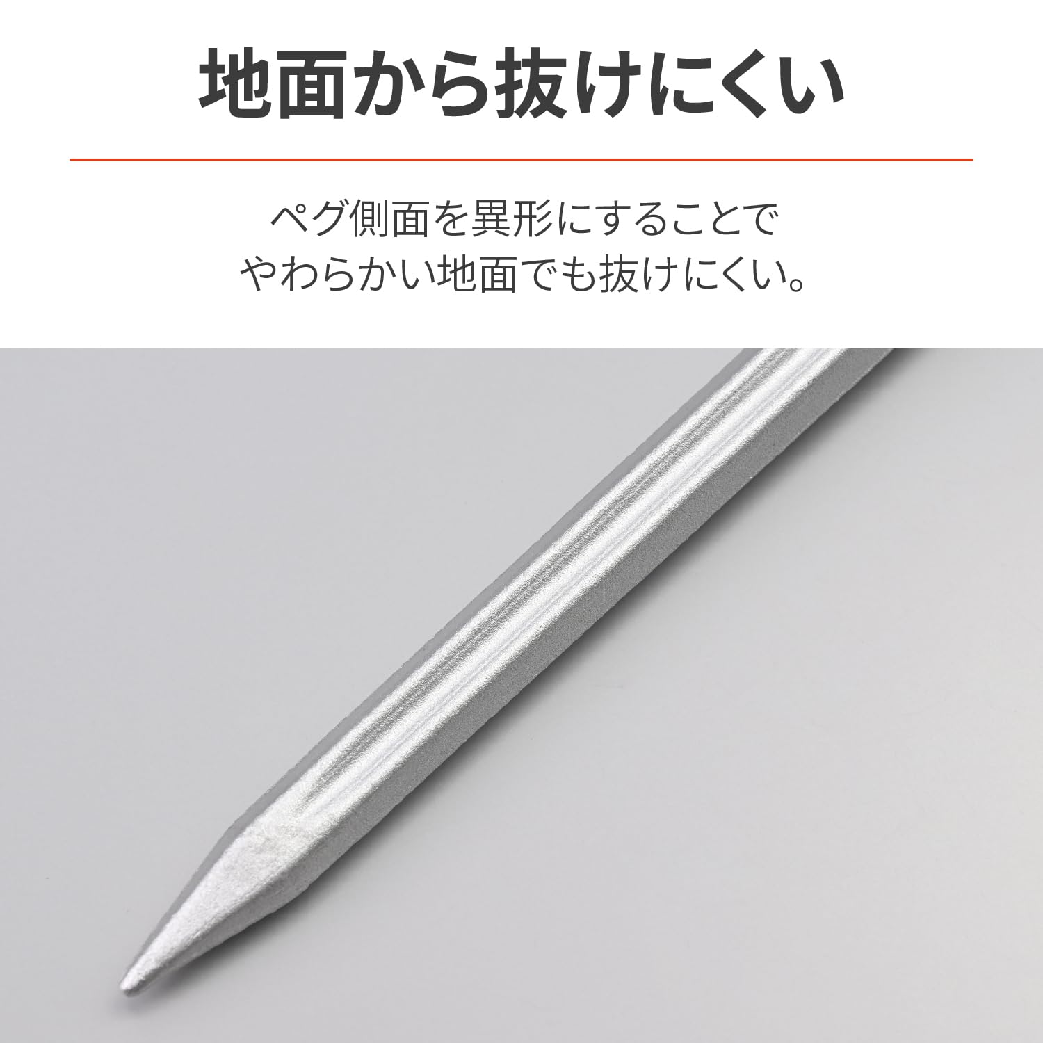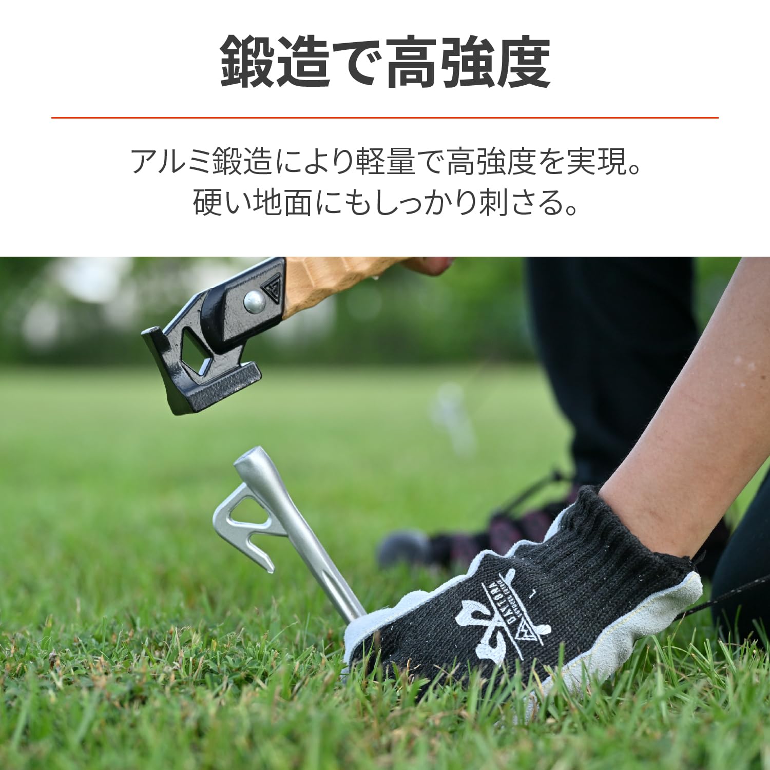 アルミ鍛造ペグの高い強度により、硬い地面にもしっかり打ち込めます。