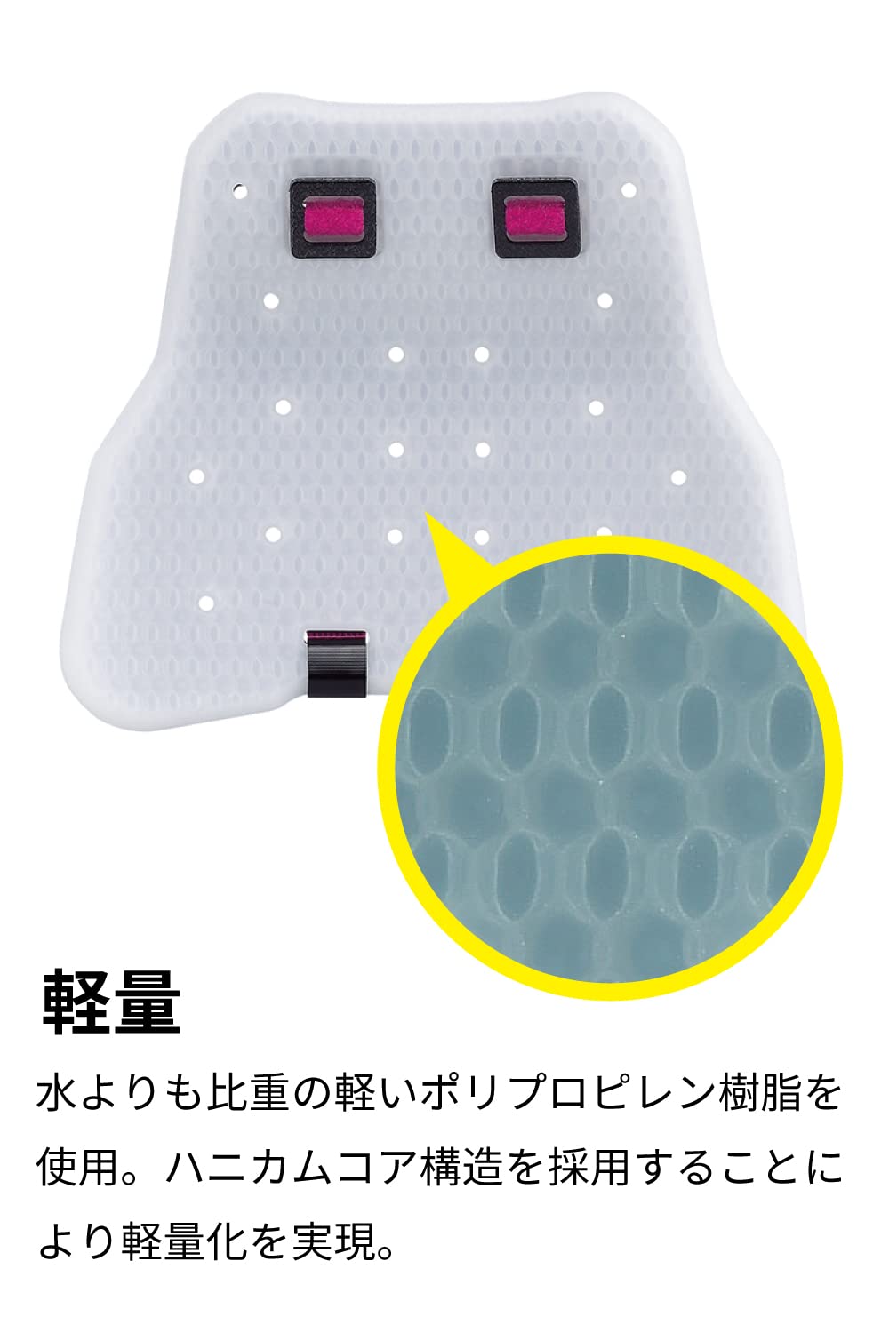 水よりも比重の軽いポリプロピレン樹脂を使用し、特殊成形技術によって構成されたハニカムコア構造を採用することによりCE規格LV.2をクリアした製品の中では世界最軽量を実現。また、単一素材形成なのでプロテクター全体で高い衝撃吸収性を発揮します。