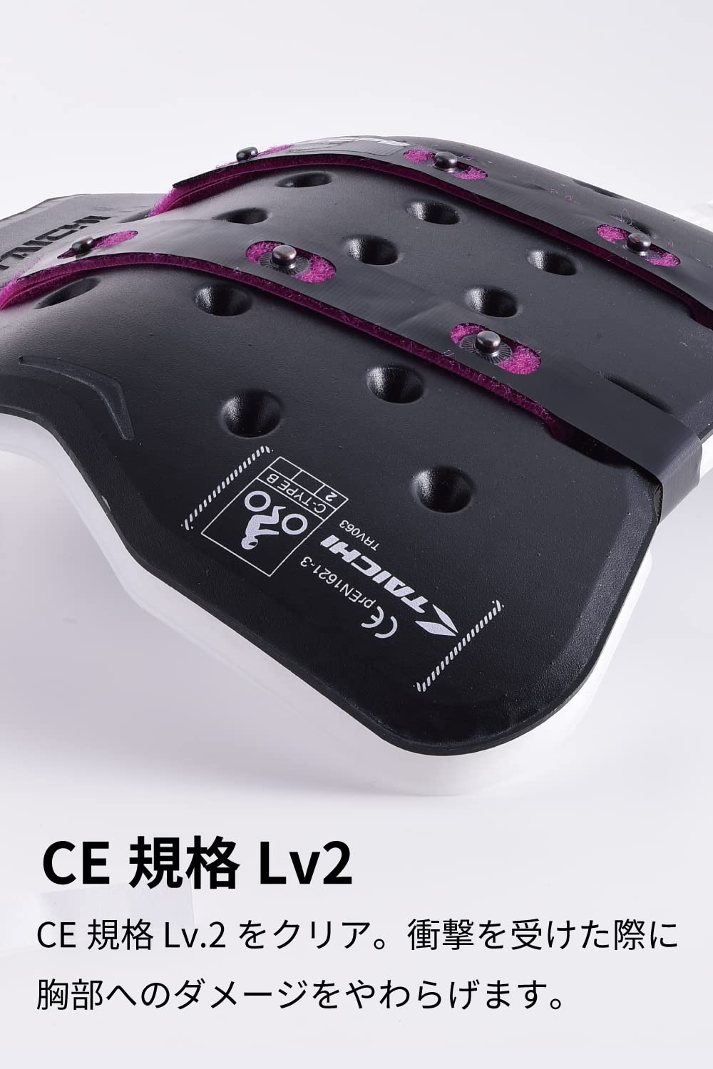 水よりも比重の軽いポリプロピレン樹脂を使用し、特殊成形技術によって構成されたハニカムコア構造を採用することによりCE規格LV.2をクリアした製品の中では世界最軽量を実現。また、単一素材形成なのでプロテクター全体で高い衝撃吸収性を発揮します。 TAICHIジャケットのCPS(チェストプロテクターシステム)はもちろん、他社製のジャケットでも、プロテクター装着用のボタンシステムがあれば簡単に装着することが可能です。ボタンシステムがない場合はTRV065(CPS用 フィッティングベルト)を購入することで身体に装着することもできます。 深刻なダメージにつながりやすい胸部を守りつつ、軽量化も併せ持ったTECCELチェストプロテクターで、万一に備えた快適なツーリングを楽しみましょう。