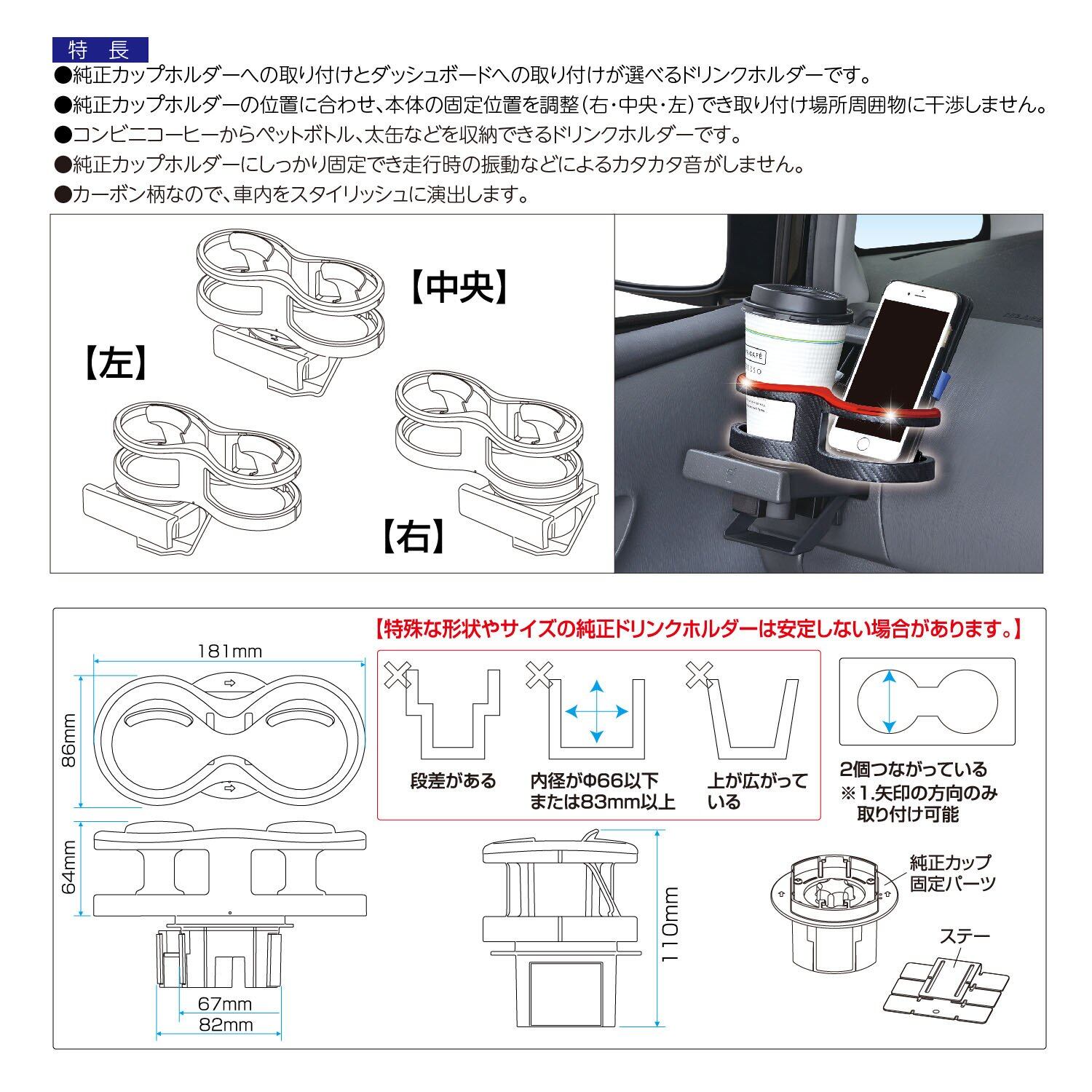・純正カップホルダーへの取り付けとダッシュボードへの取り付けが選べるドリンクホルダーです。
