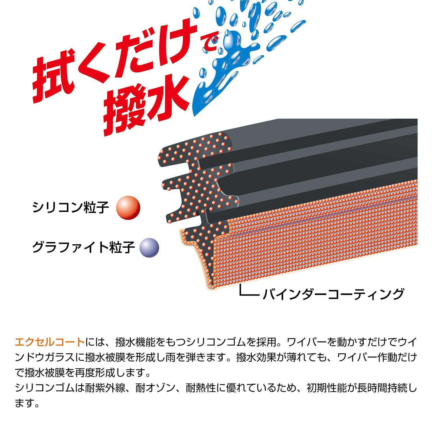 エクセルコートワイパーは最高品質シリコンゴムを採用。ワイパーを作動させるだけで撥水膜を形成し雨をはじきます。ウインドウガラスにガラス撥水コーティングをされていても使用でき、撥水効果が薄れてきてもワイパーを作動のみで撥水膜を再度形成します。