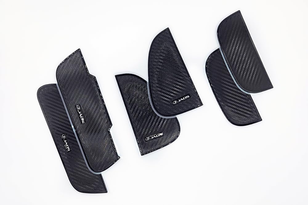 ドア開閉時にうっかり付いてしまうドアハンドル部のひっかきキズや汚れを防止するドアハンドルプロテクター。車種のドアハンドル形状(くぼみ)に合わせてカットされた専用設計で、カーボン調のデザインがドアハンドル部をスポーティにドレスアップします。強力な粘着面で接着するため、簡単に剥がれることなくしっかり貼付けることができます。