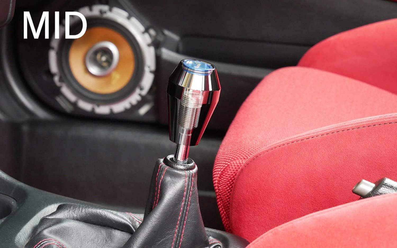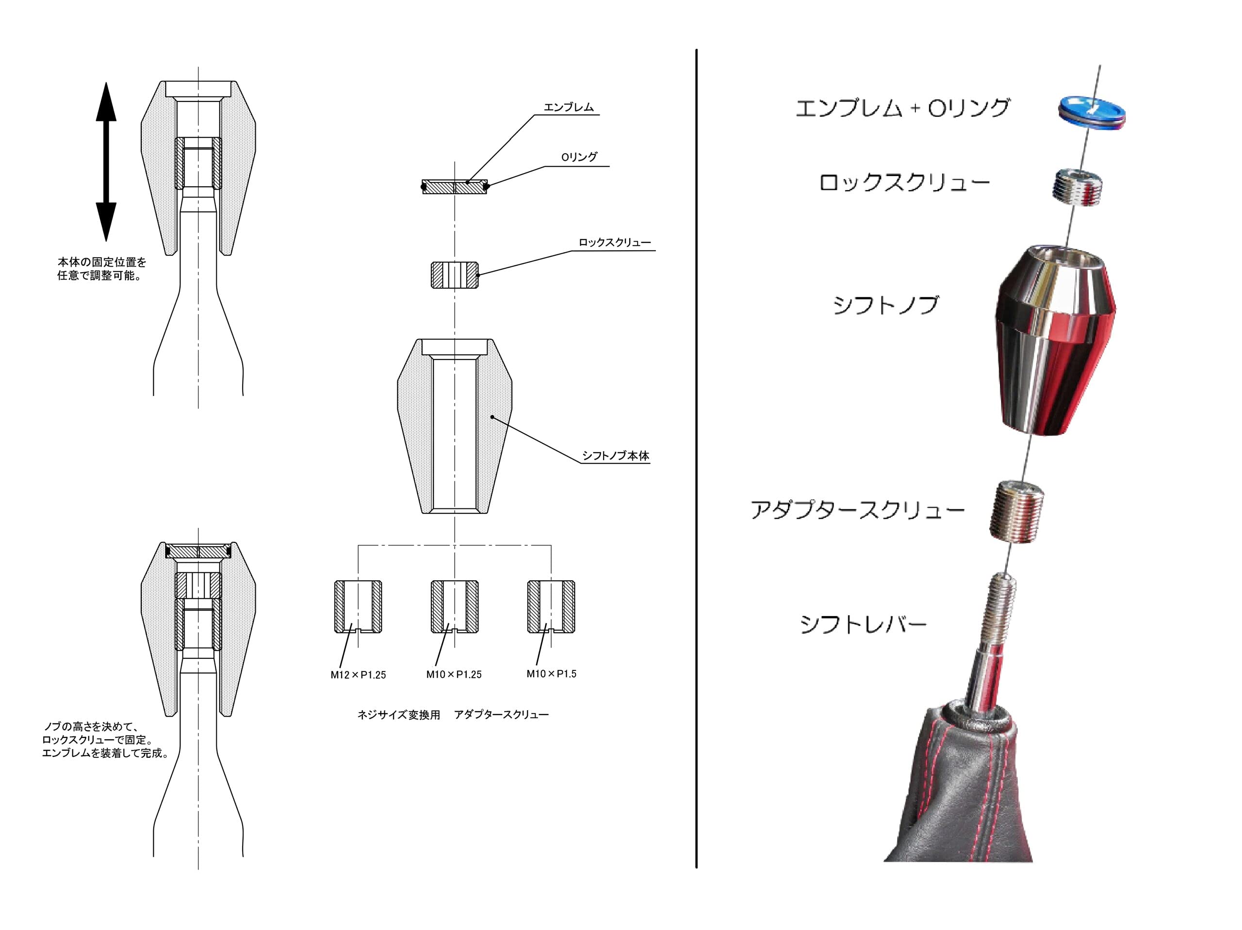 高さ調整機能付きアルミ製シフトノブ ●純正シフトレバーネジサイズ 3種類に対応(M10P1.25、M10P1.5、M12P1.25)。 ●取付け高さの無段階調整が可能。(調整範囲:A02約15mm) ●金属製アダプターにより高剛性な取付け。 ●5種類のシフトパターンステッカー付属。 《装着重量》:188~194g リバースロックレバーがノブに入り込むタイプの6速MT車。 ロックレバーがノブに入り込む部分の外径が22 ミリまで対応。
