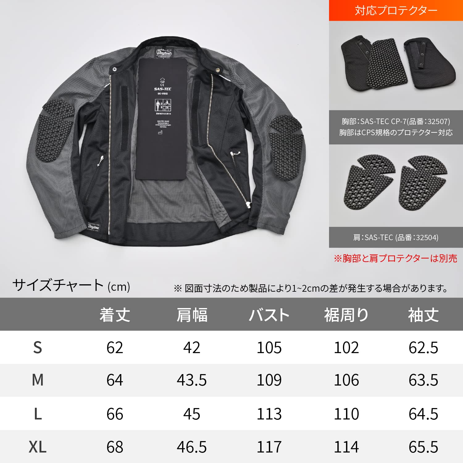 ひじ、背中のプロテクターは、SAS-TECのTRIPLEFLEXタイプを標準装備。