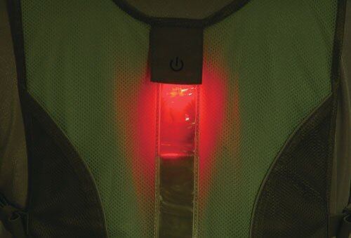 背面のリフレクターとLEDユニットにより、ウェアの上に着用するだけで夜間被視認性を大幅にアップさせます