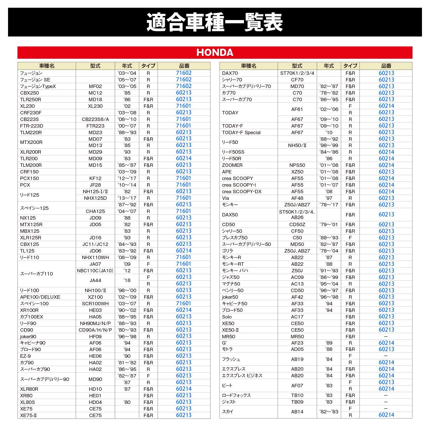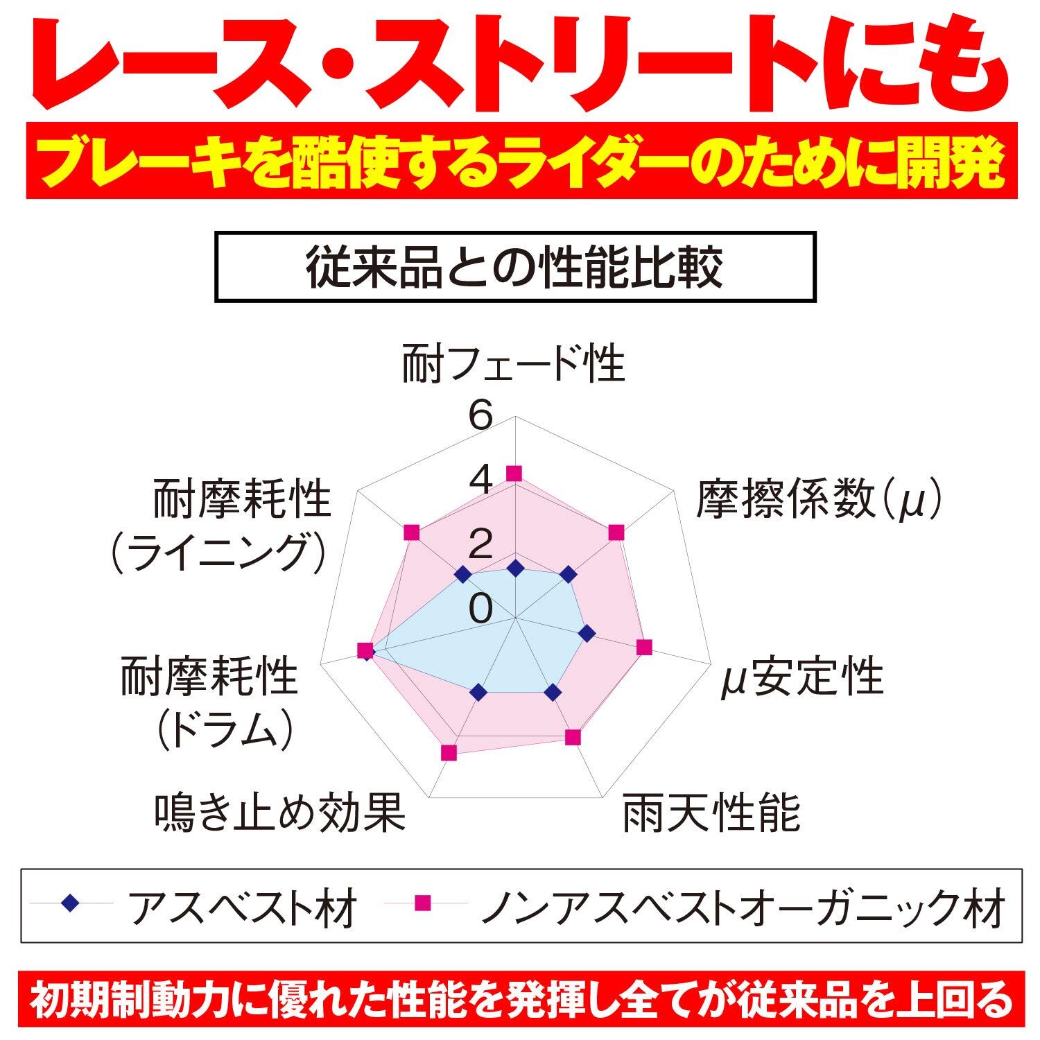 従来品と比べ初期制動、摩擦係数、耐フェード性、耐摩耗性、雨天性能などを改善し、リニューアルいたしました。