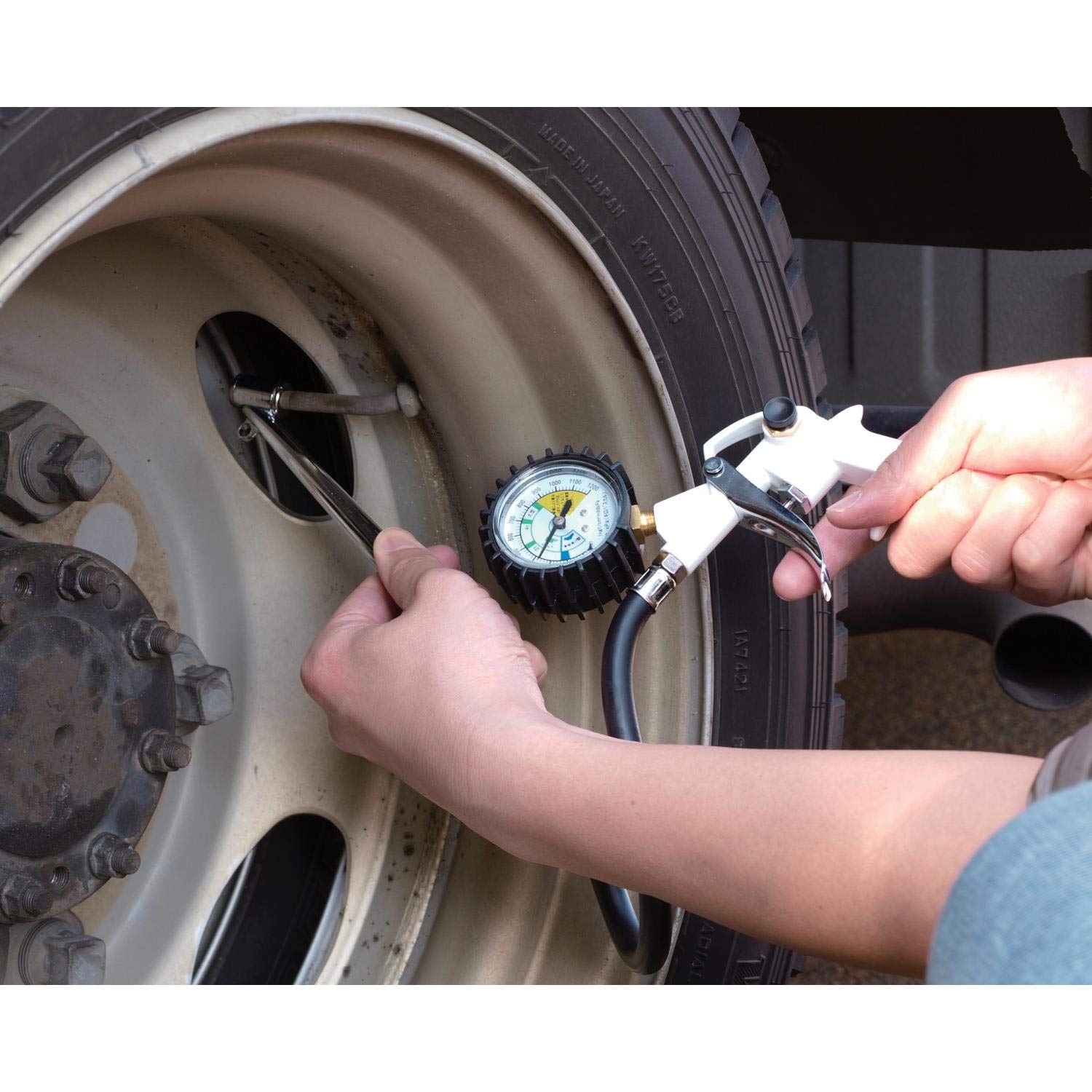 車のタイヤ空気圧測定と調整。