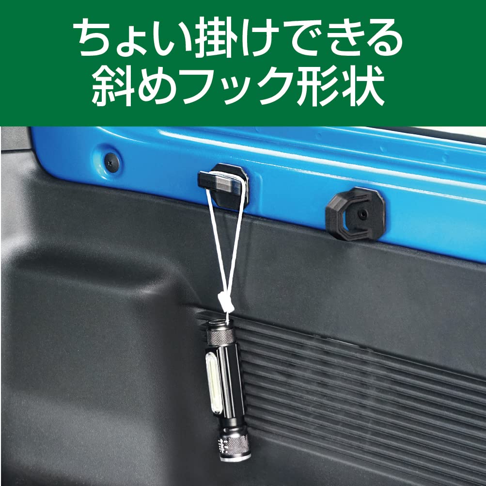 斜めフック形状は、LEDライトのストラップやビニール袋などのちょい掛けに重宝します。