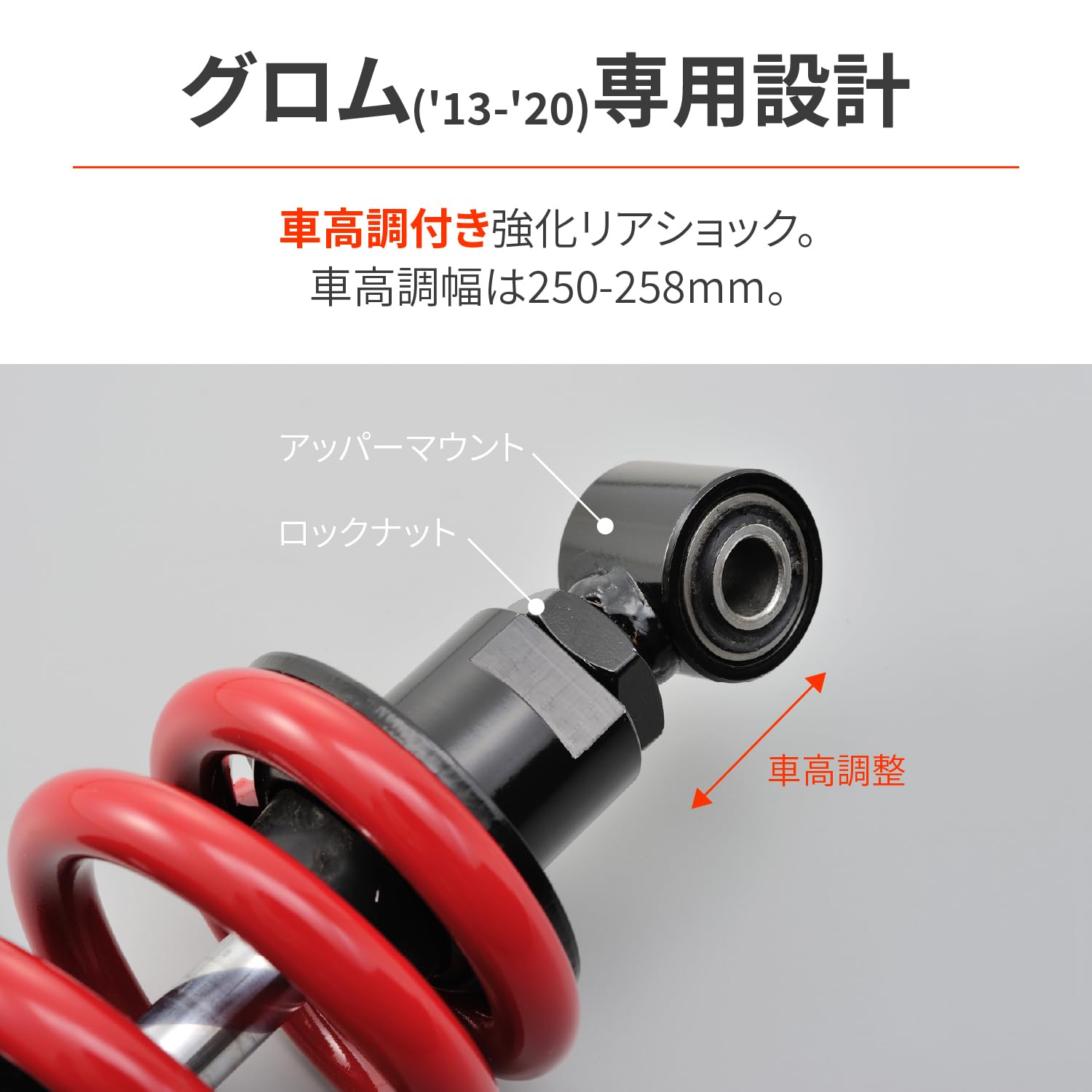 デイトナ(Daytona) バイク用 リアサスペンション グロム(13-20)専用 250-258mm 車高調整機能付き 乗り心地改善 強化リアショック ブラックボディ/レッドスプリング 92482