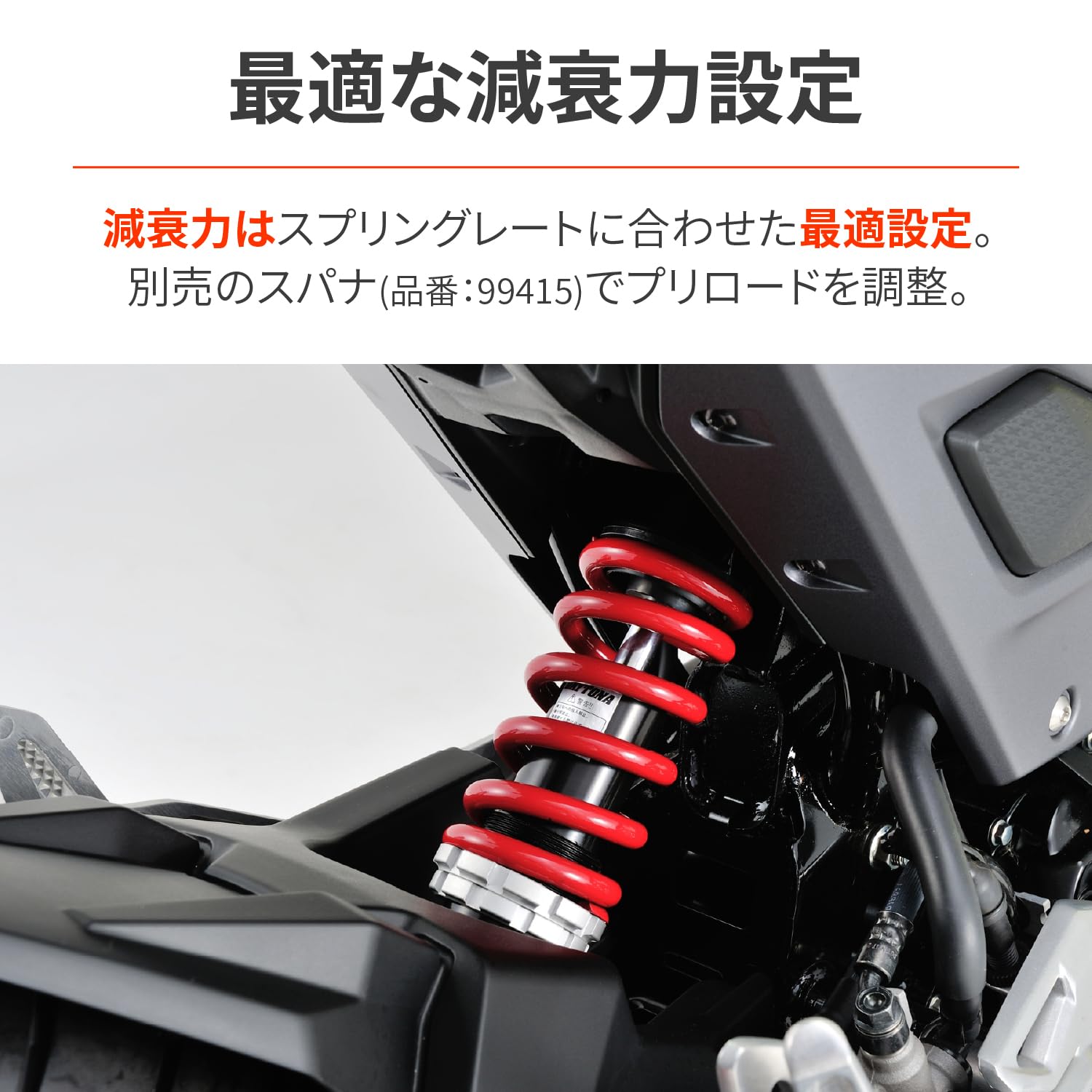 ※イニシャル調整工具は別売りのアジャスタブルリングスパナ(43926)を2本使用してください。※ノーマルリアショック長:245mm※サイドスタンドはノーマルが使用可能。※車高が若干上がるため、足つき性が悪くなりますのでご注意ください。
