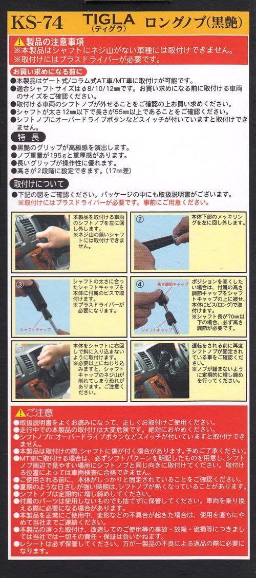●ゲート式AT車/MT車用/コラム車用ノブです。 ●黒艶グリップ仕様、重さが195gと重厚感があります。 ●ブーツ部はクロムメッキ仕上げの高品位アルミ素材です。 ●適合シャフトサイズφ8/10/12mm。 ●ねじ込み式で簡単取り付け。