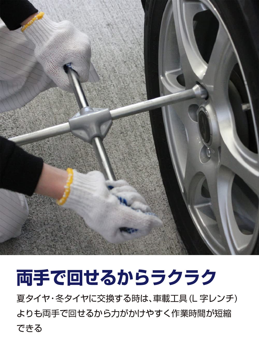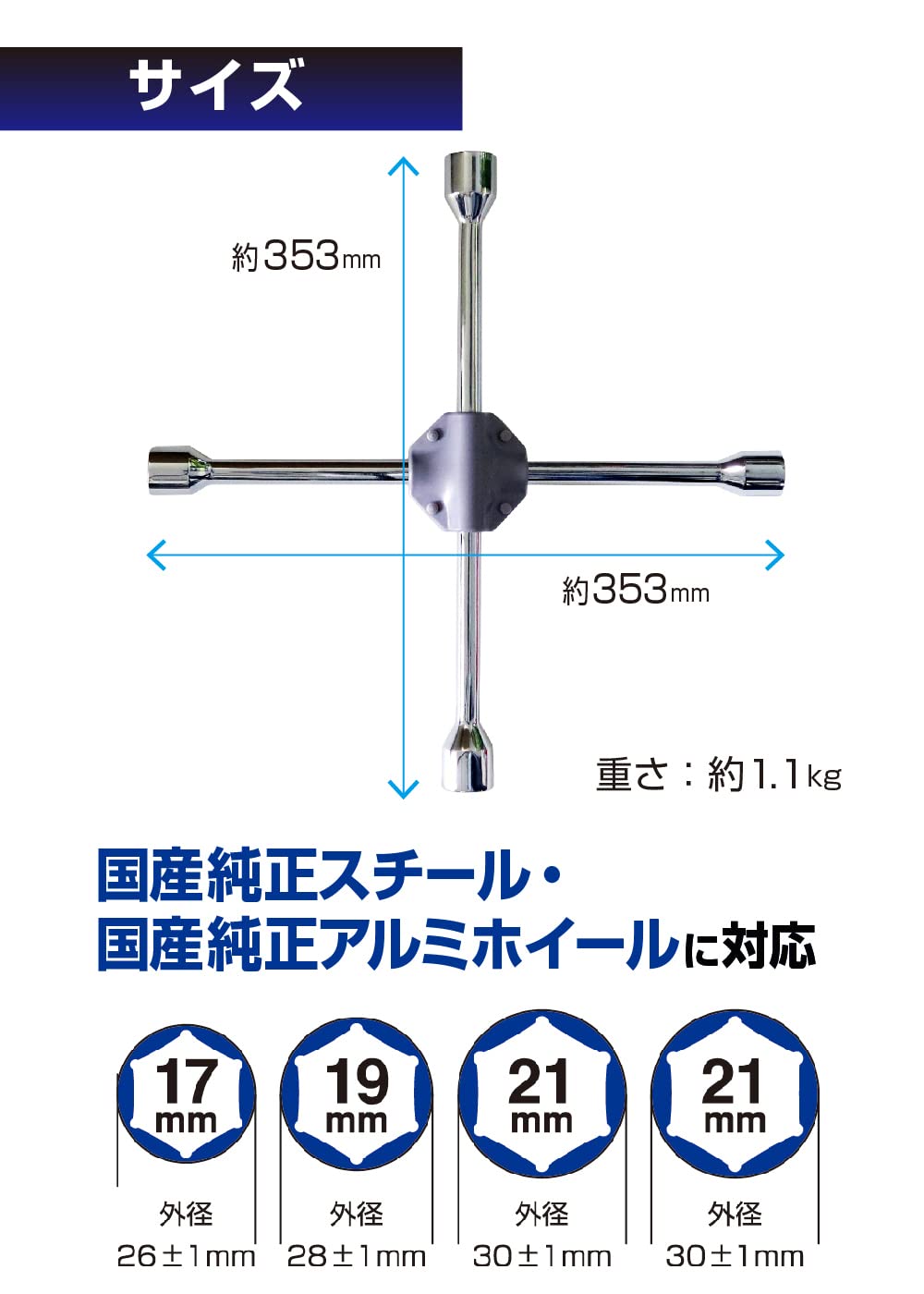【使用上の注意】 ※工具本来の使用用途以外には、使用しないでください。 ※本製品を足で蹴ったり踏んで使用しないでください。 ※パイプを使って過度に力を加えないでください。 ※サイズが合っていなかったり不十分な取付状態で使用すると、ボルト・ナットを傷めたり、本製品の破損を招く事があり危険です。サイズが合っていることを確認して作業をしてください。 ※ナット穴が小さいホイールには使用できません。 ※一部の外品アルミホイールで使用できない場合があります。