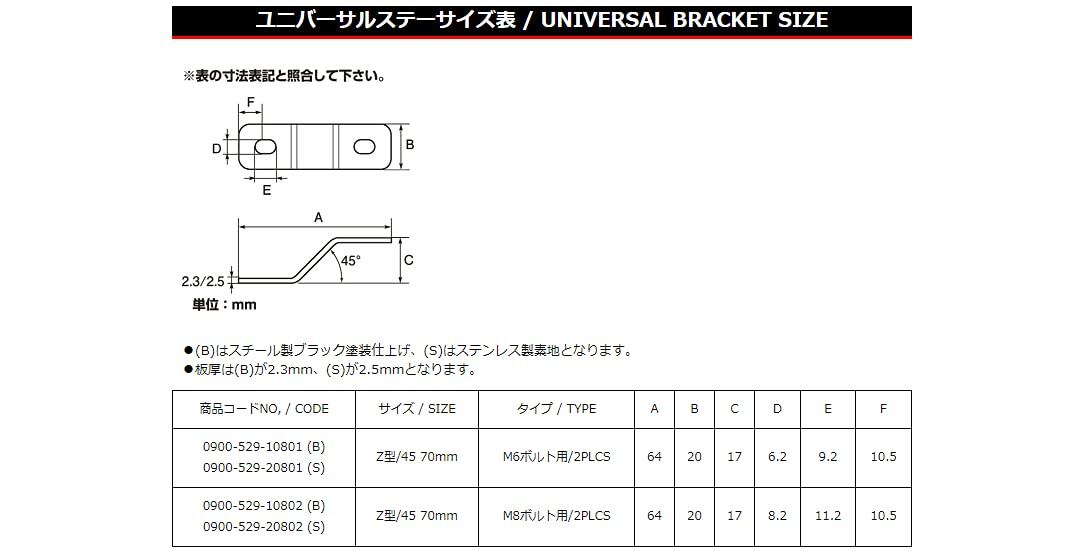 キタコ(KITACO) ユバーサルステー Z型/70mm(2.5mm厚) M6ボルト用/2PLCS 汎用 ステンレス 0900-529-20801