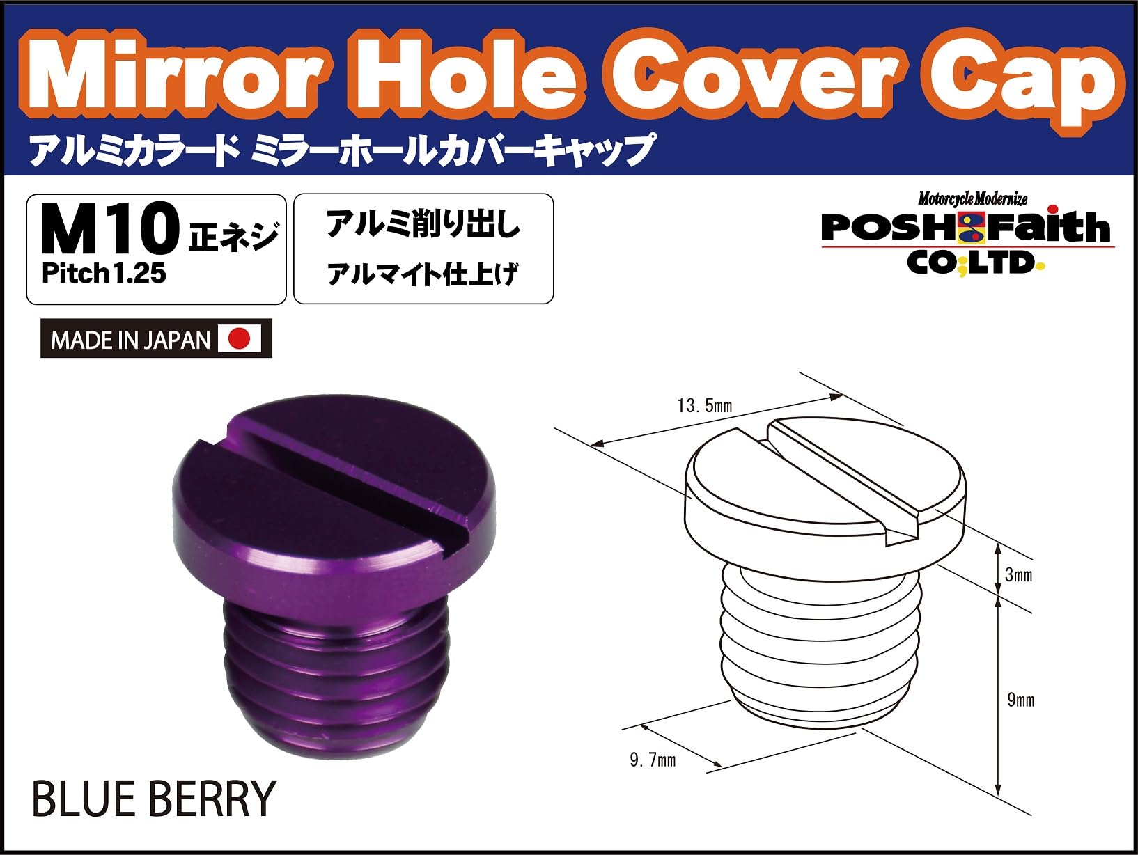 【大特価商品】ポッシュフェイス(POSH FAITH) バイク用品 アルミカラードミラーホールカバーキャップ(1個入) M10-P1.25 正ネジ 1個入り ブルーベリー 000806-05 | ももくま屋さん