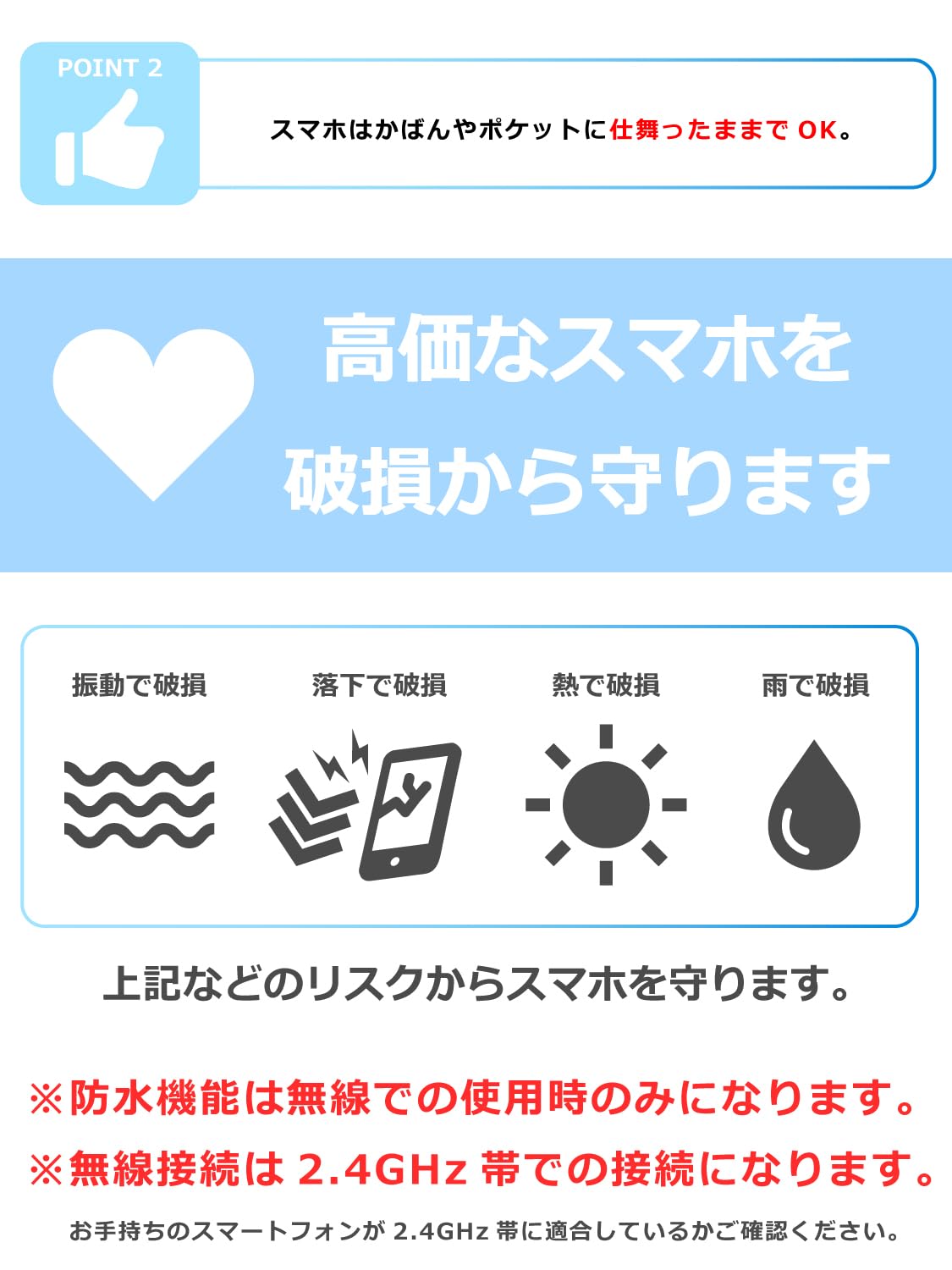 脱落、振動、雨や熱など悪天候によるトラブルから、便利なスマホの機能は生かして高価な本体を守ります。