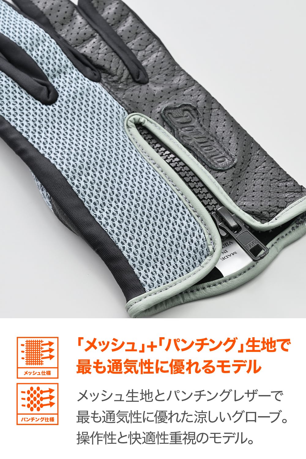 メッシュ+パンチングレザーで通気性と耐久性を両立させた春夏グローブ。
