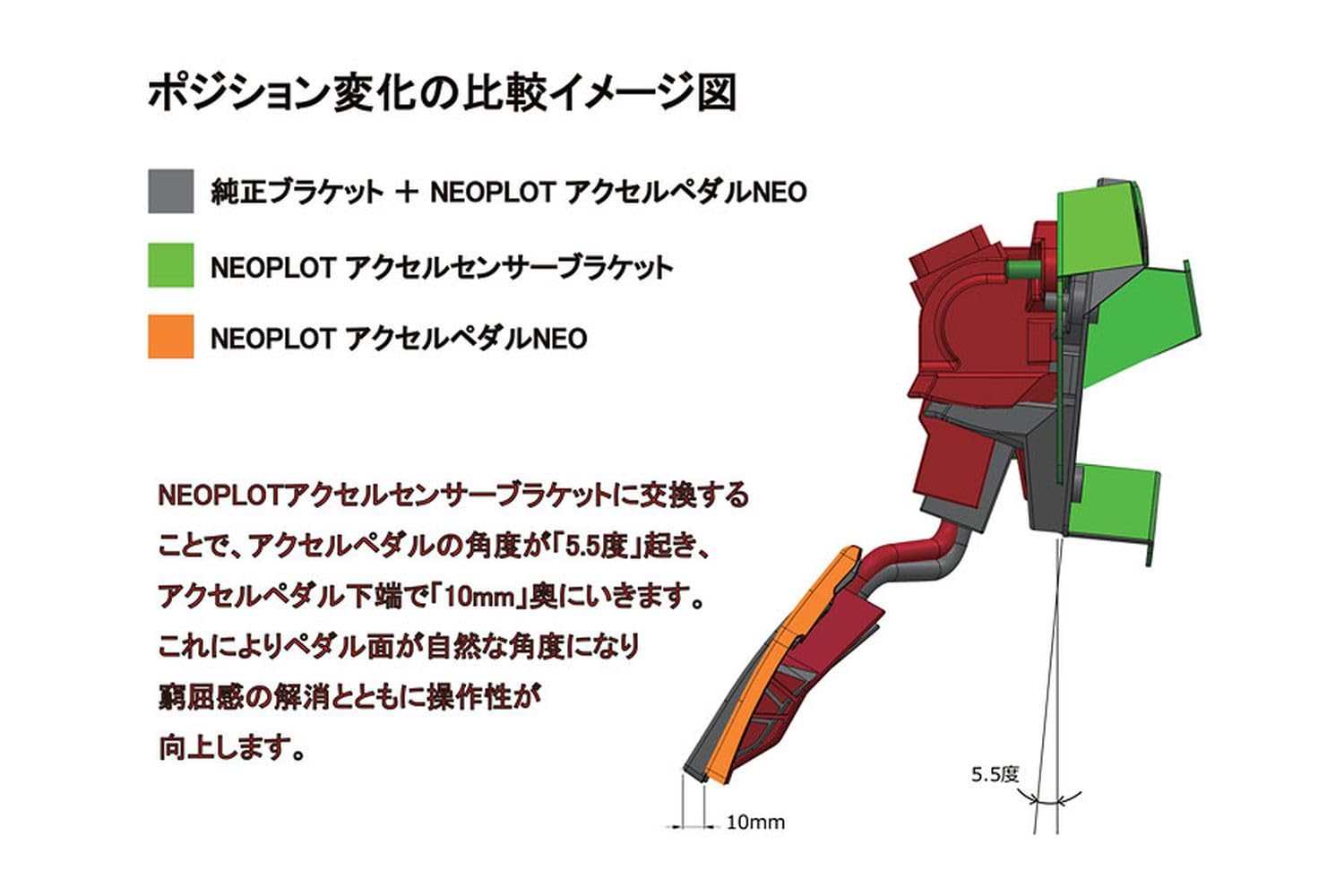 NEOPLOTアクセルセンサーブラケットに交換することで、アクセルペダルの角度が「5.5度」起き、アクセルペダル下端で「10mm」奥にいきます。