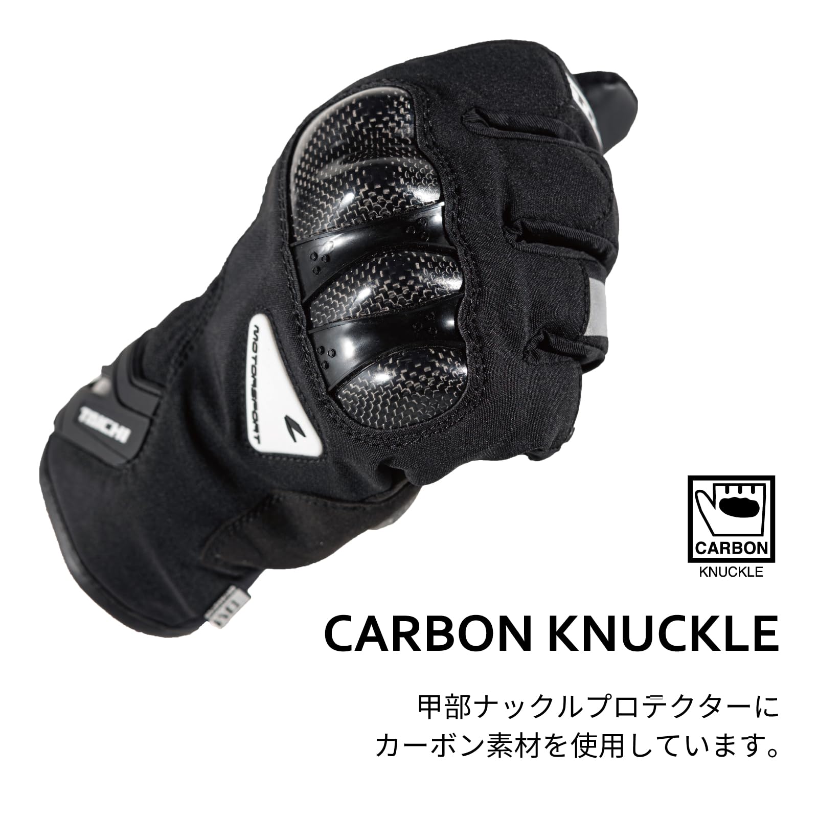 手の甲と掌下部にカーボンプロテクターを配置し、高いプロテクション性能と保温性を兼ね備えた、秋冬向けのスポーティーモデル。手首のフラップは大型でスムーズな着脱が可能。手首までカバーするロングカフ仕様にすることで、保温性を高めています。