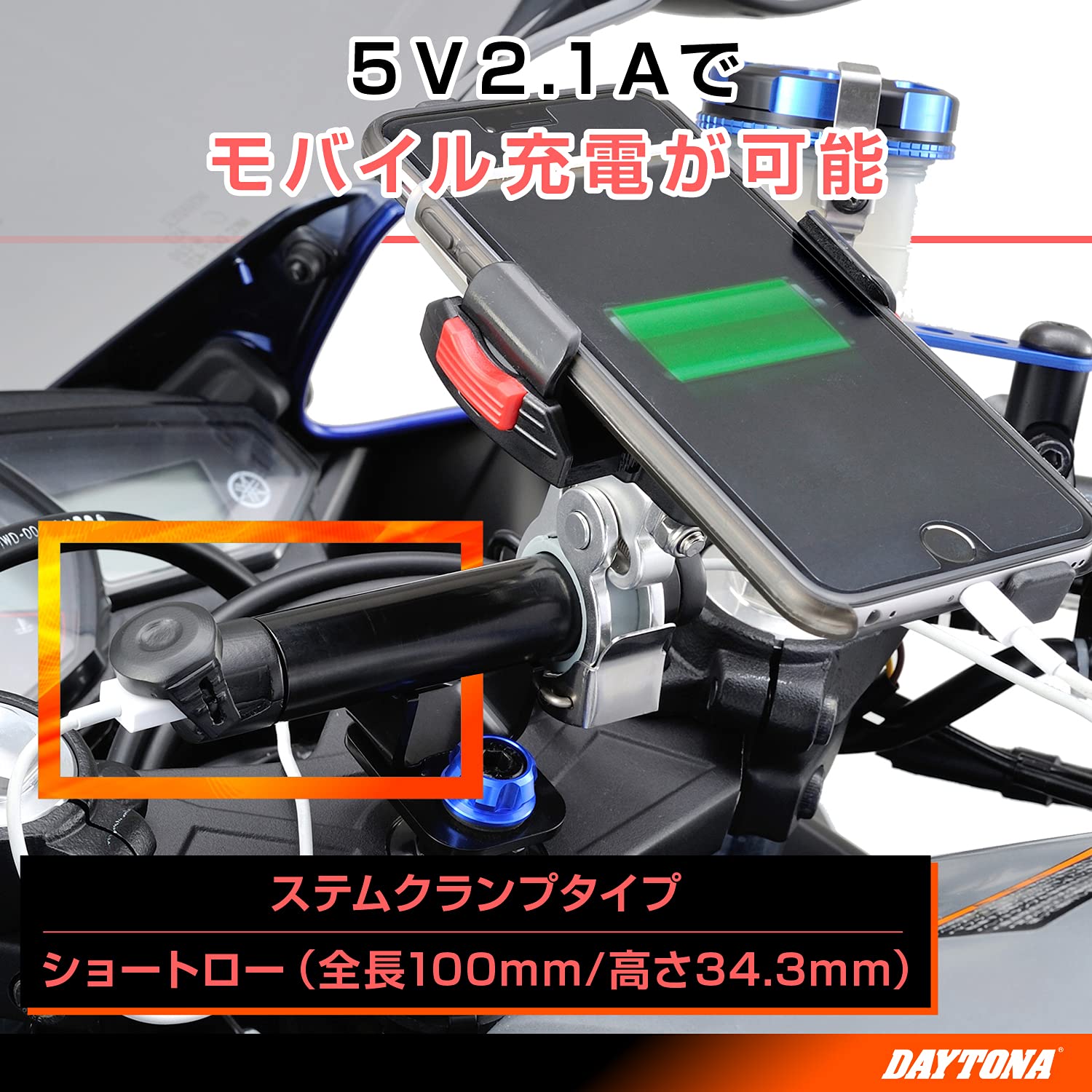 デイトナ(Daytona) バイク用 USB電源&クランプバー USB(5V/2.1A) iPhone/Android対応 ステムクランプ マルチバーUSB電源 ショートロー 100mm 93382