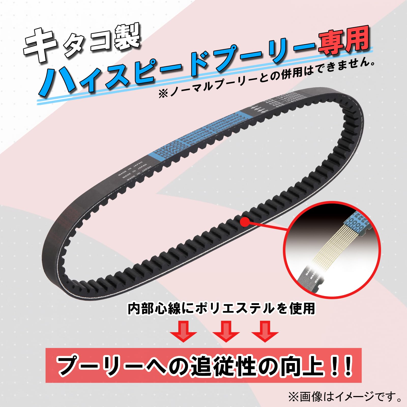ハイスピードプーリー用に最適設計された専用ドライブベルト。純正品より若干長めの最適な長さに設計することにより、最高速が向上。