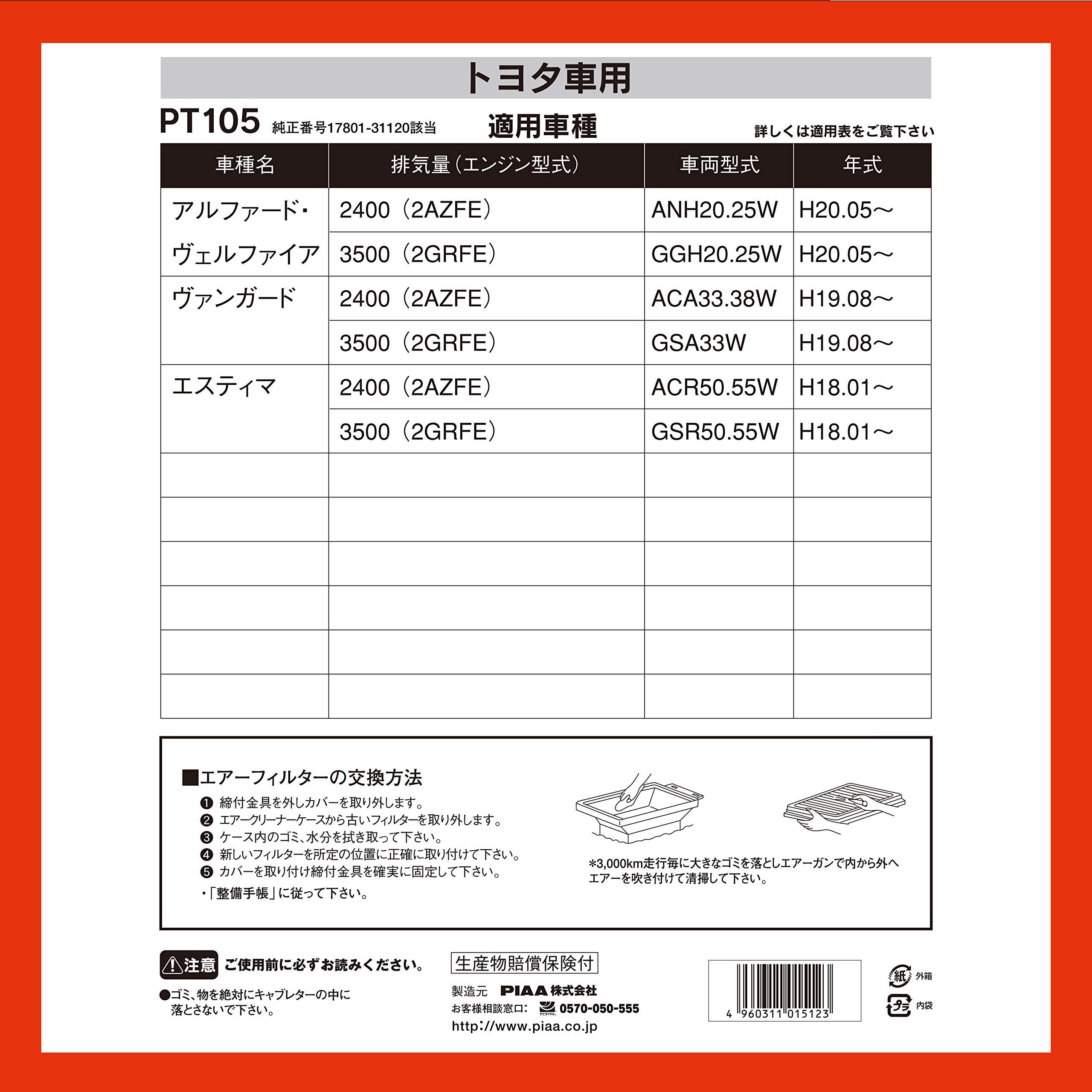 PIAA(ピア) エアーフィルター (エアフィルター) 1個入 [トヨタ車用] アルファード・ヴェルファイア・エスティマ_他 PT105