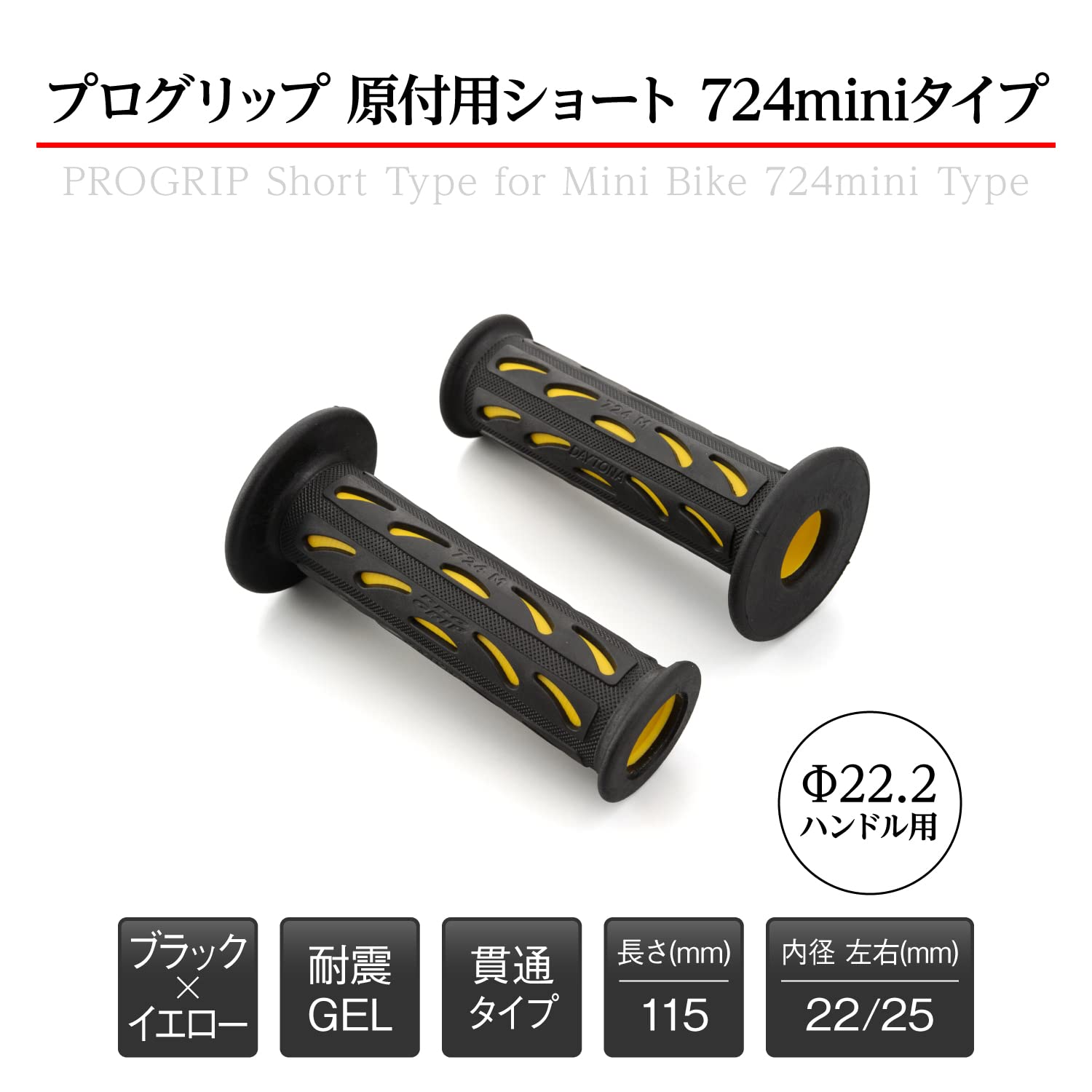 デイトナ(Daytona) PROGRIP(プログリップ) バイク用 グリップ ハンドル径φ22.2(原付)用 115mm 耐振ゲル エンド貫通 724Miniタイプ イエロー 98078