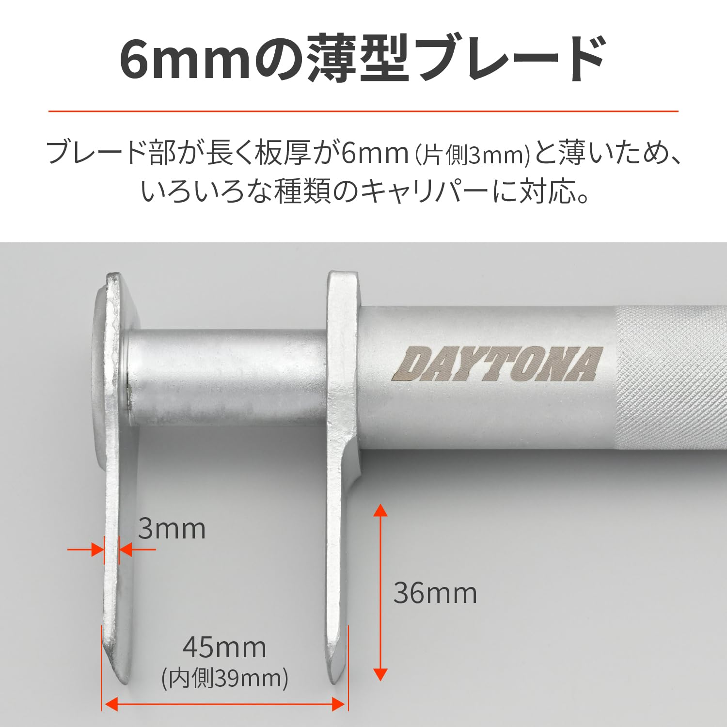 薄型ブレード(厚み6mm)採用で、様々なキャリパーに対応