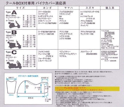 ●テールBOXを装着したままでカバーが掛けられます。 ●TypeAは50~90cc、TypeBは100~125cc、TypeCは250ccのスクターにそれぞれ対応します。