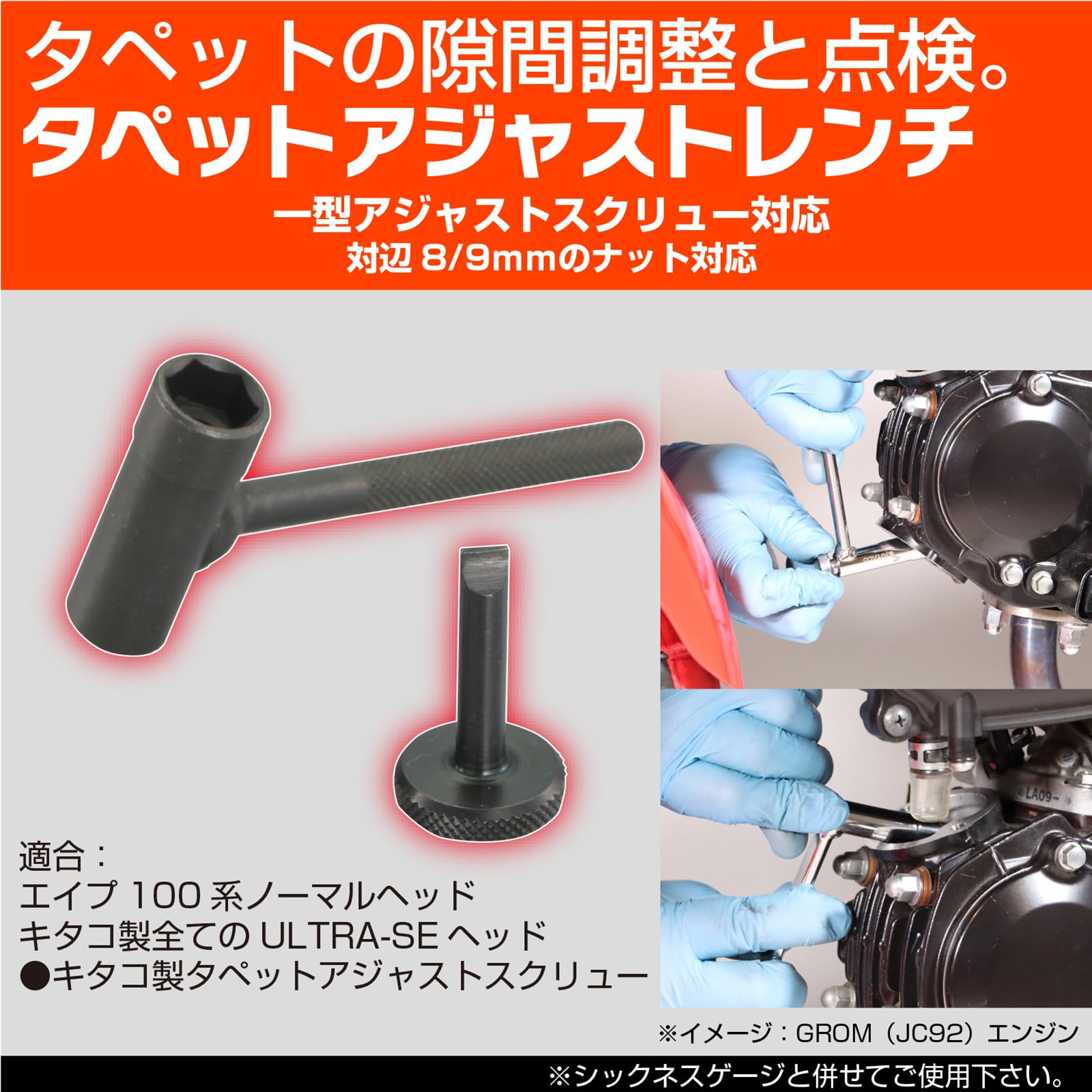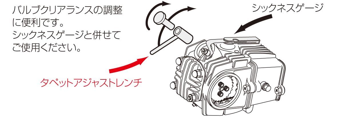 モンキー、スーパーカプ系エンジン及び、CB、APE系エンジン(OHC車)のタペットの隙間の調節、点検をする為の工具です。シックネスゲージと併せてご使用下さい。