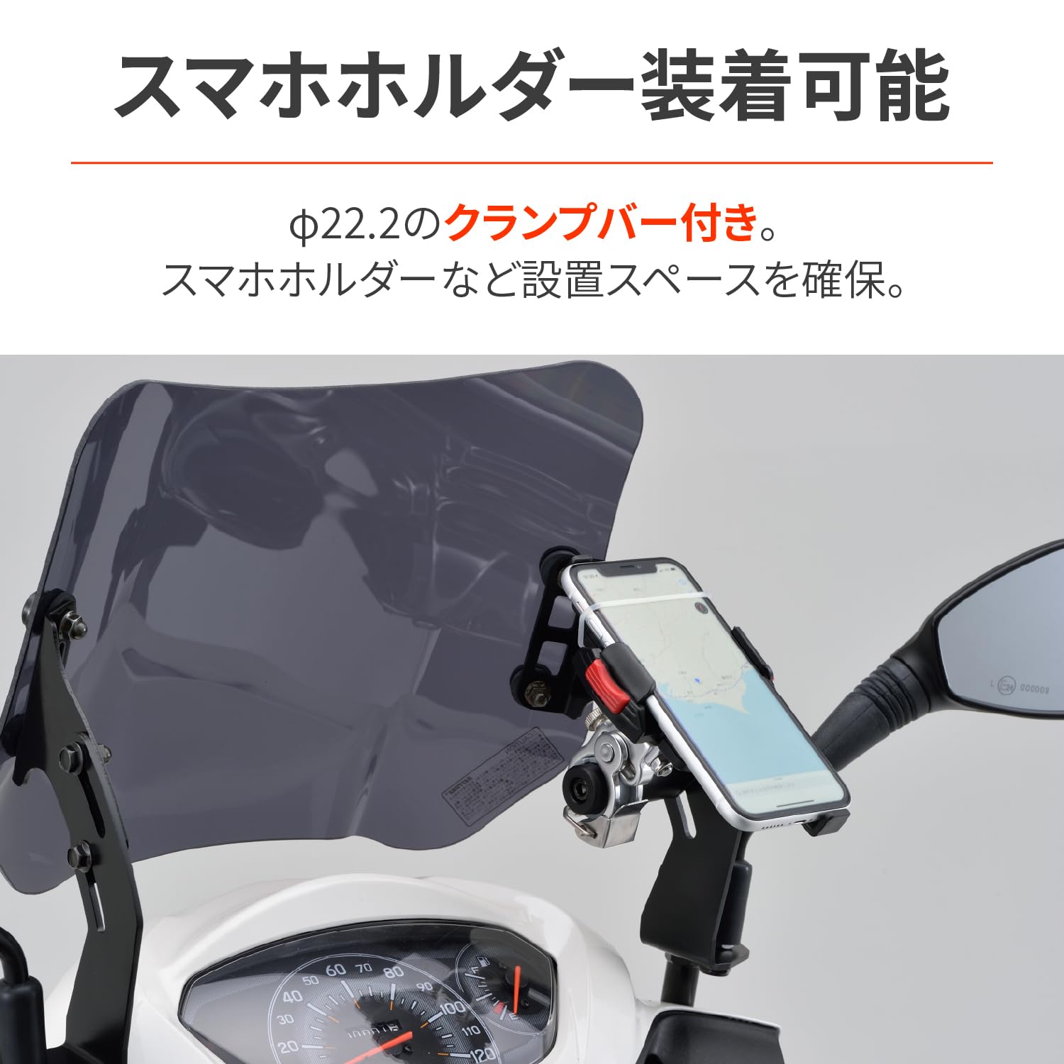 【仕様3】Φ22.2mmのクランプバーを同梱。スマートフォンホルダーなどのデジモノ装着が可能です。
