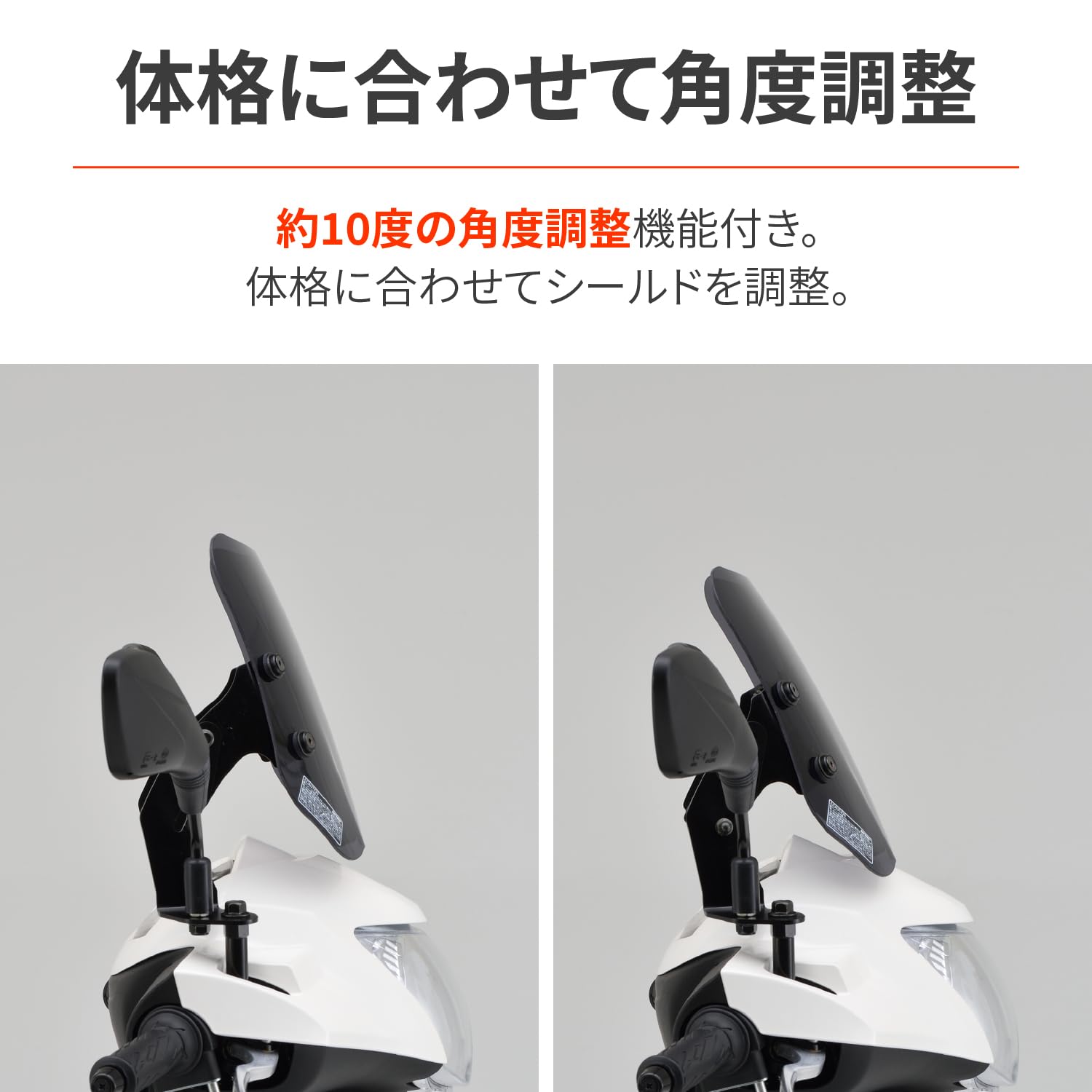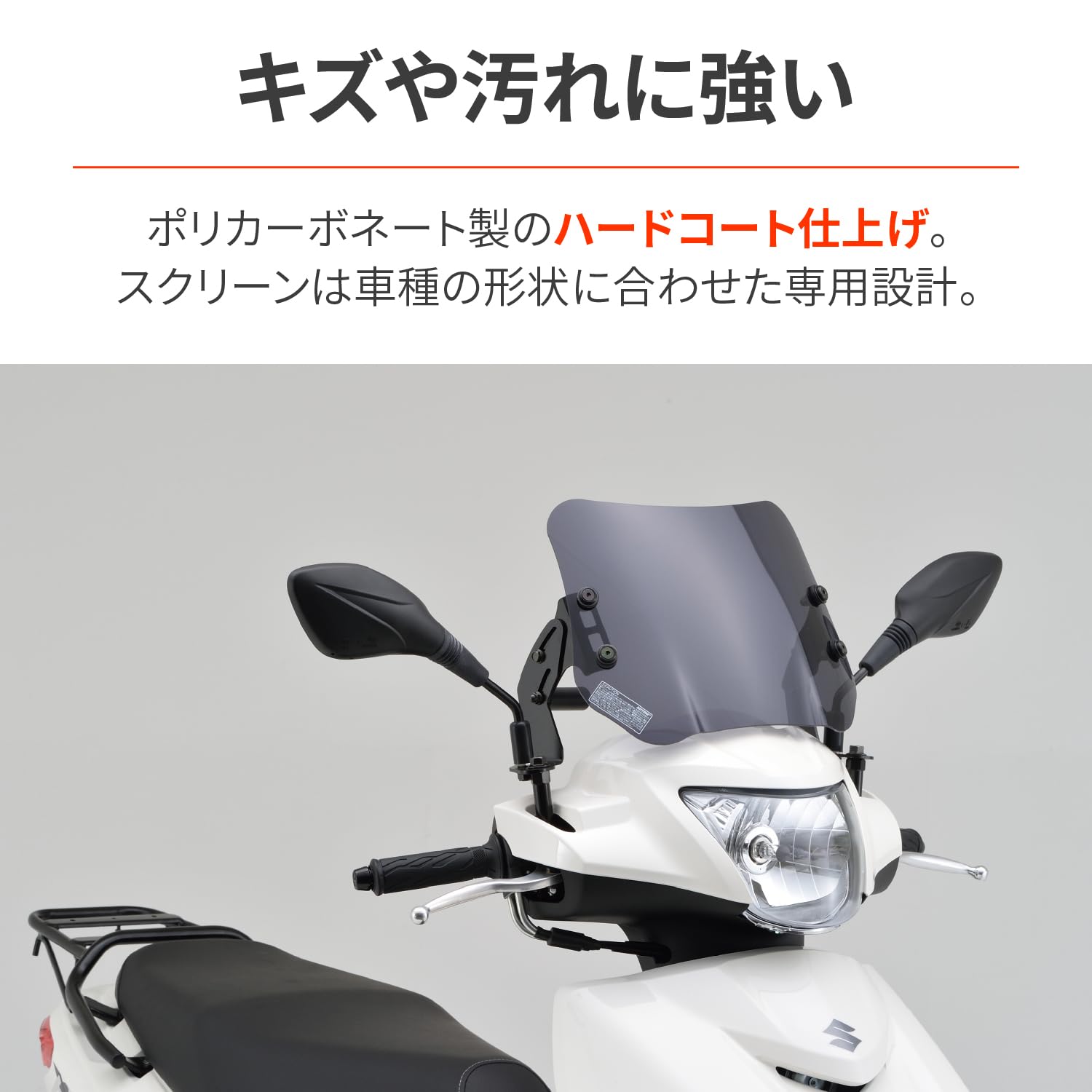 アドレス125 (18-20)[2BJーDT11A]用シールド。空気抵抗による疲労軽減、雨や虫よけに効果があります。シールドは三次元立体成型によるタイリッシュなデザイン。Φ22.2mmのクランプバーを同梱。スマートフォンホルダーなどのデジモノ装着が可能です。シールドは衝撃に強いポリカーボネイト製。傷や汚れに強いハードコーティング仕様だから、長期に渡ってクリアな視界を確保します。