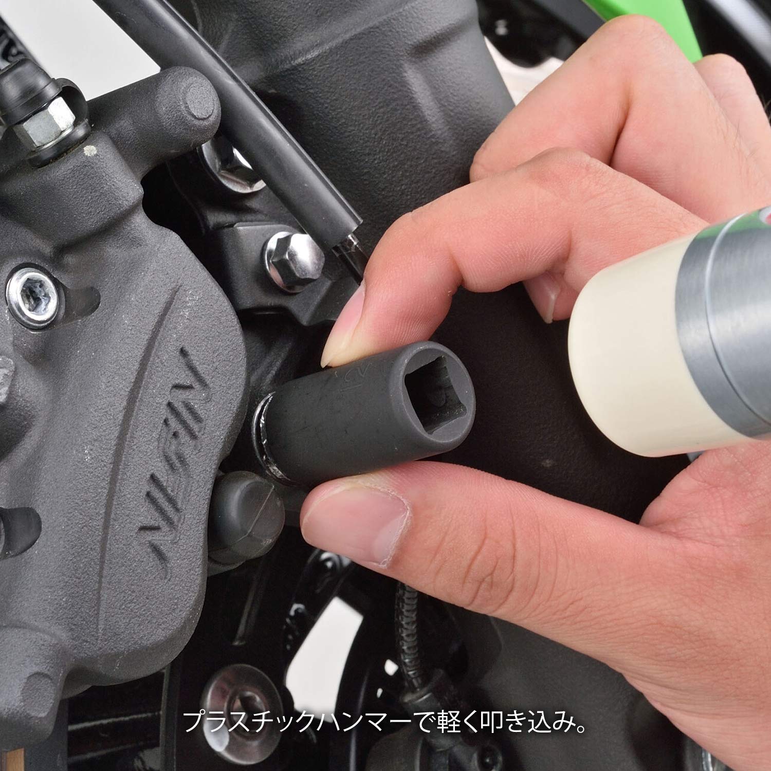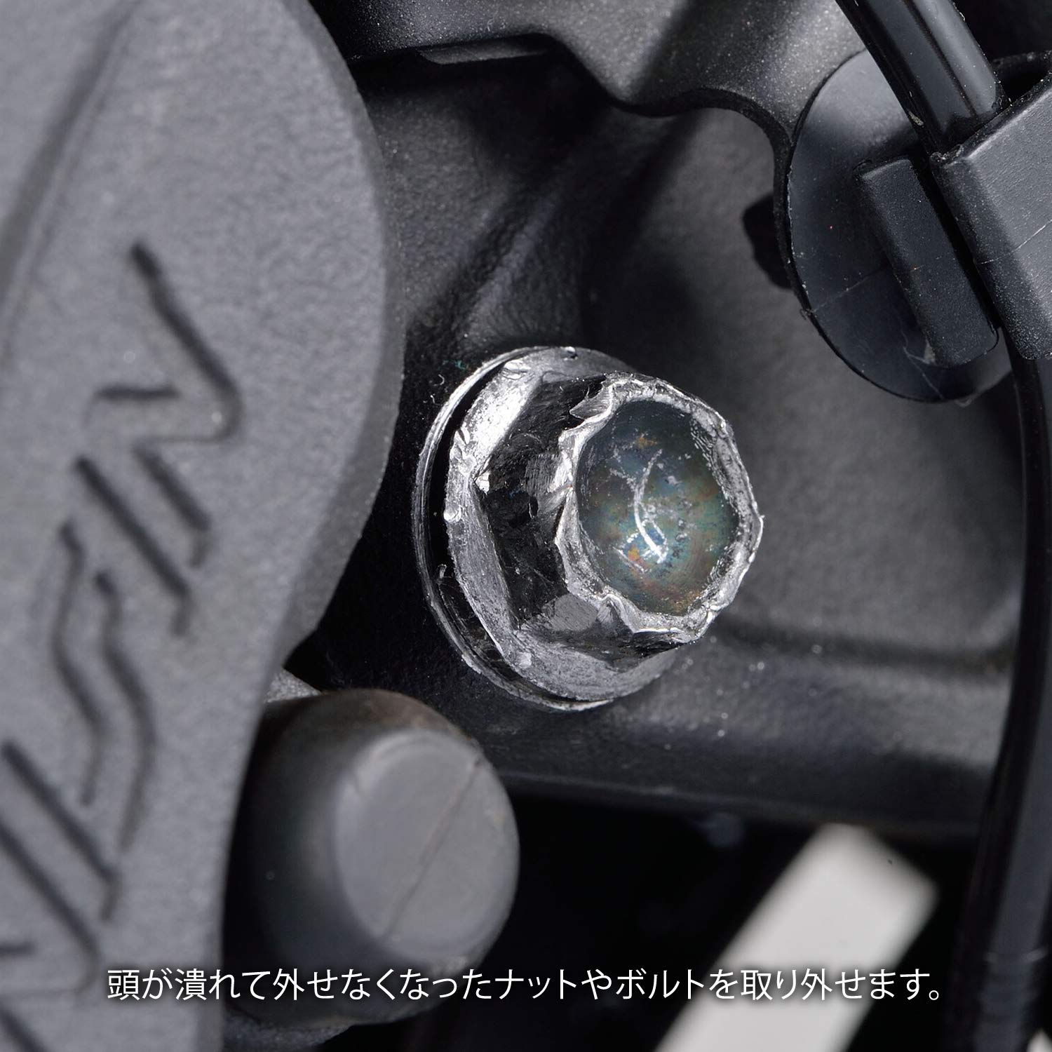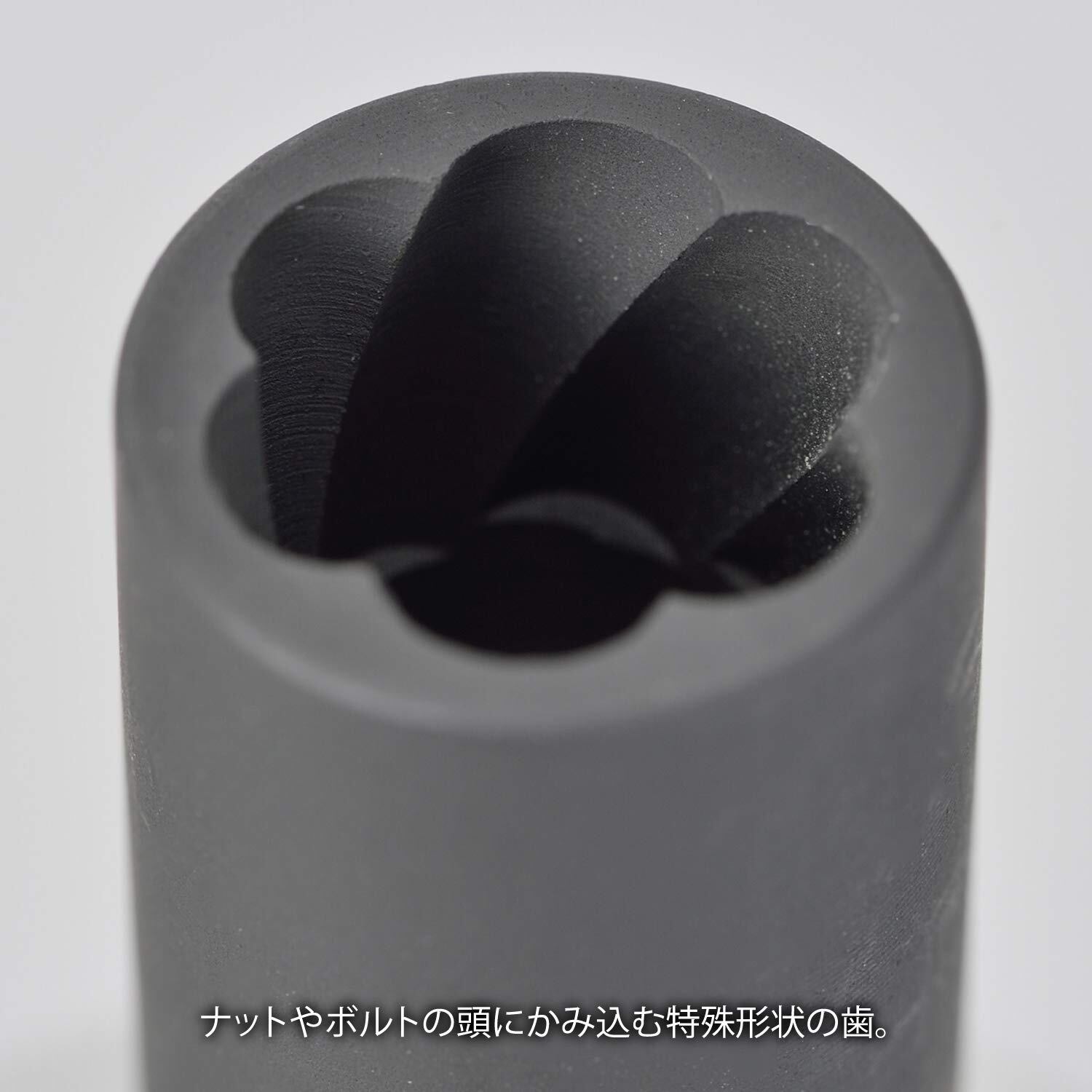 経年劣化やオーバートルクにより頭が潰れて外せなくなったナットやボルトを、特殊形状のソケットが強力に掴み簡単に取り外すことができます。頭が潰れて外せなくなったナットやボルトにプラスチックハンマーで軽く叩き込み、押しながら緩めてください。