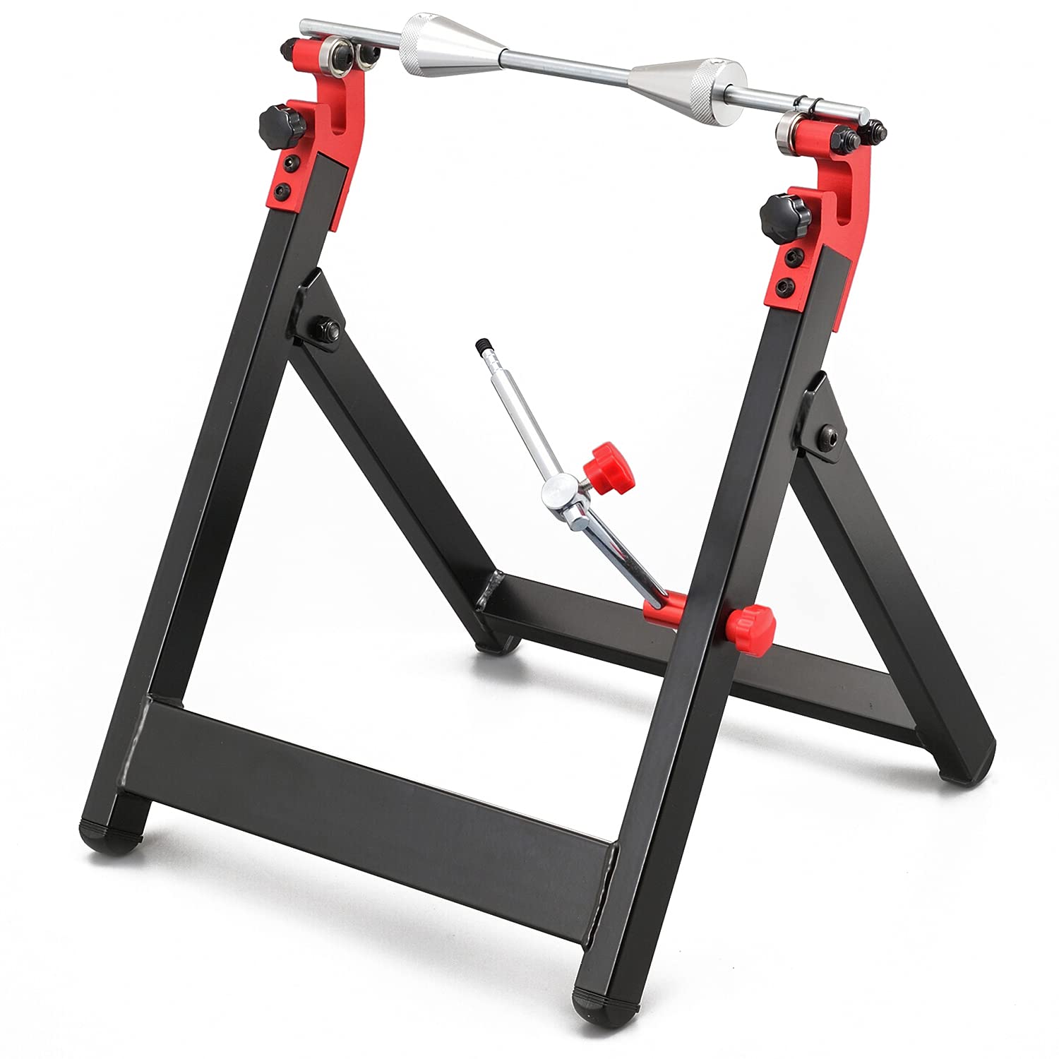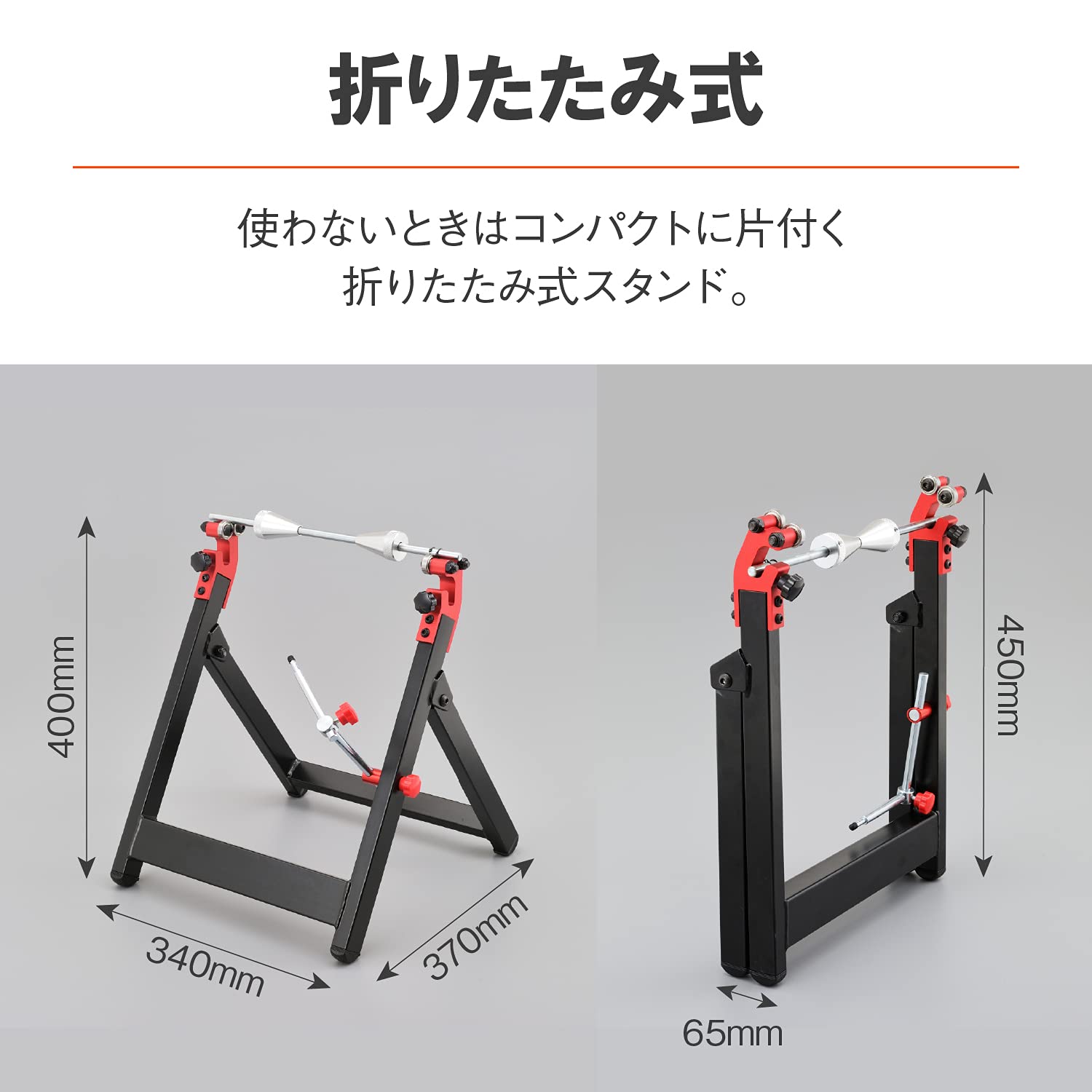 ホイールのバランス調整と振れ調整、ベアリングチェック、スポークホイールの張り・調整が簡単にできる折りたたみ式スタンド。