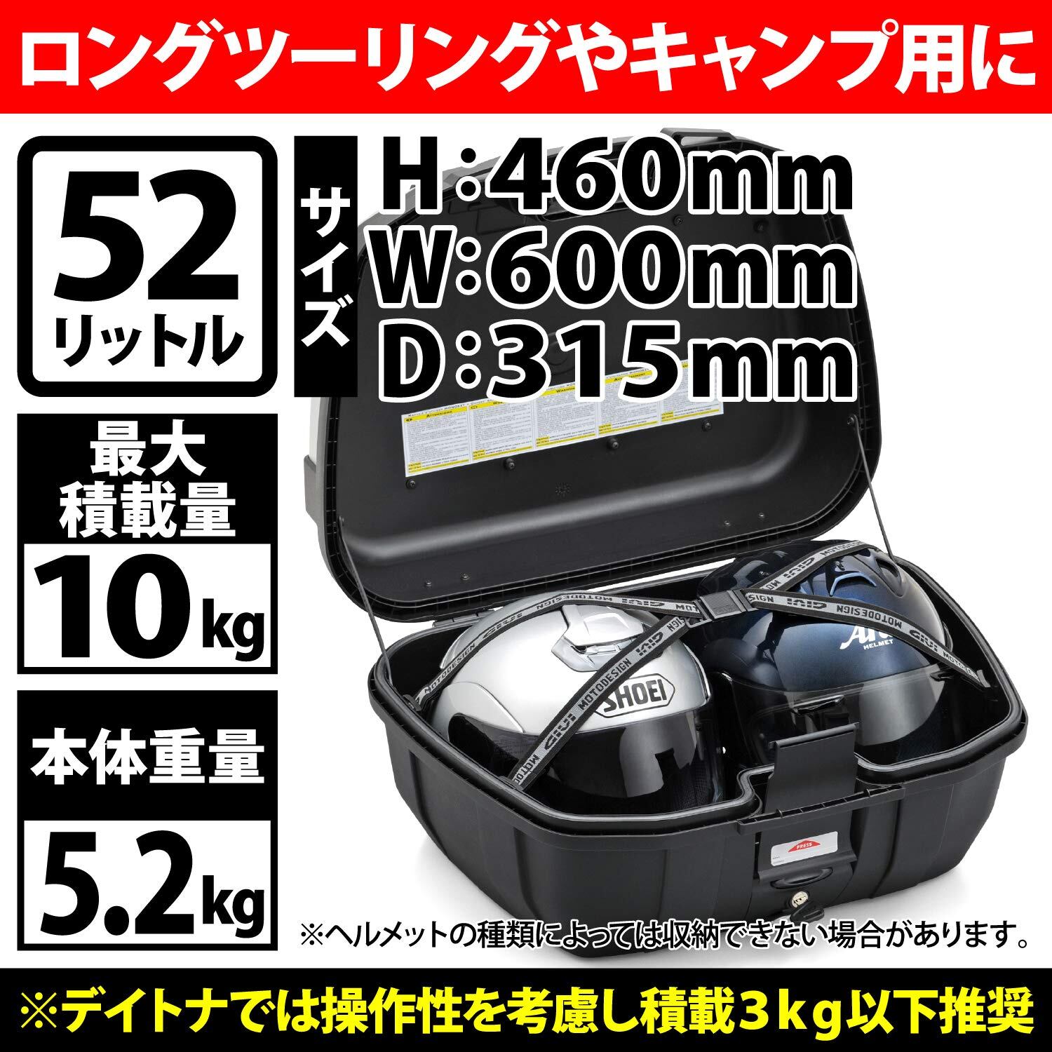 【仕様2】容量:52L、最大積載重量:10kg(操安性上、3kg以下の使用をお薦めいたします。)