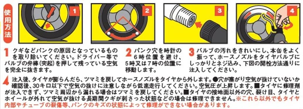 パンクしたその場で直せます。タイヤも同時に膨らみます。チューブレス、ラジアルタイヤに最適です。小型バイク125㏄以下に使用可能です。