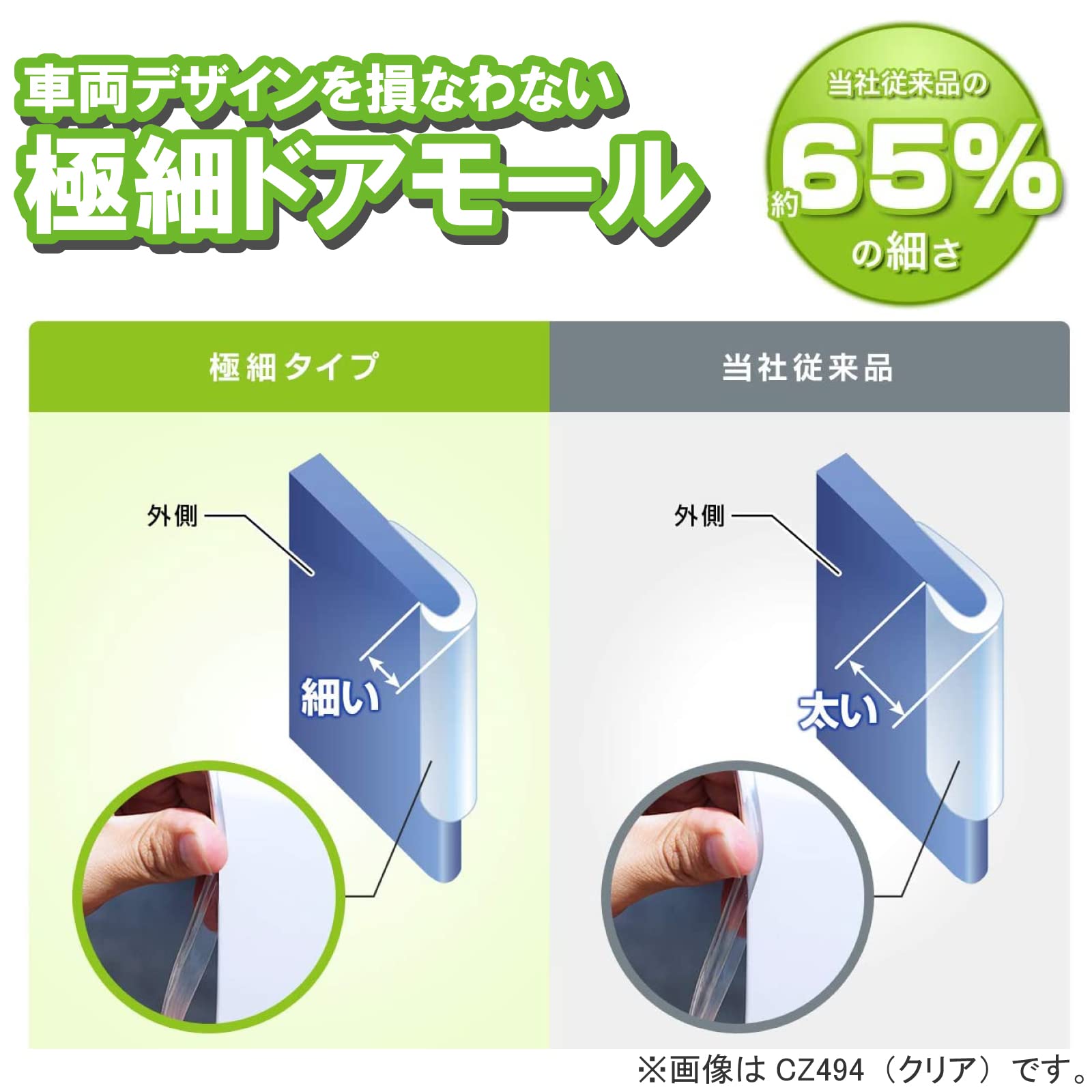 外側から見えるモールが従来品比で65%の細さになり、保護性能は変わらず車外から目立たないドアモール