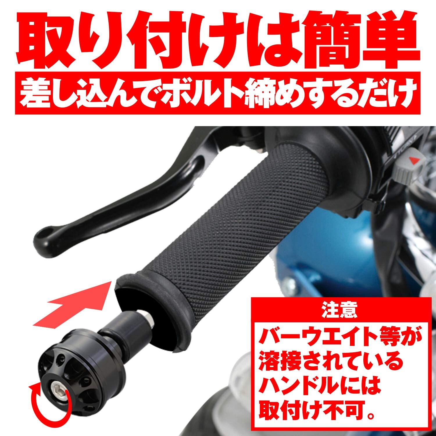 ●幅広く対応する汎用タイプのアルミビレッドバーエンド! ハンドルのドレスアップ、転倒時のレバー、スロットル、グリップの保護に最適です。