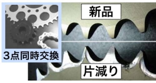 スプロケットは消耗品です。一般走行時目安として約1000km走行ごとにスプロケットの点検を行って下さい。日常の注油により、スプロケット及びチェーンの寿命は格段に向上します。