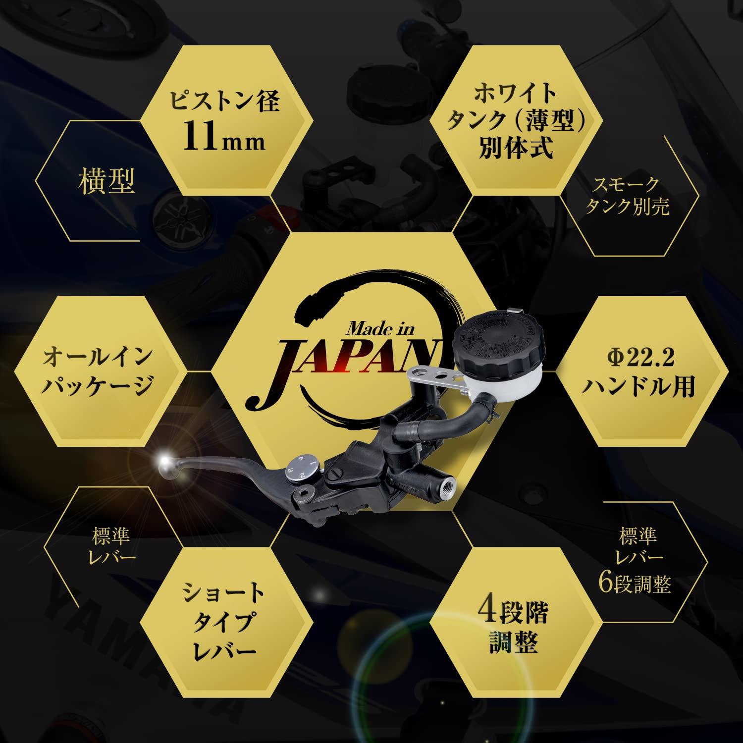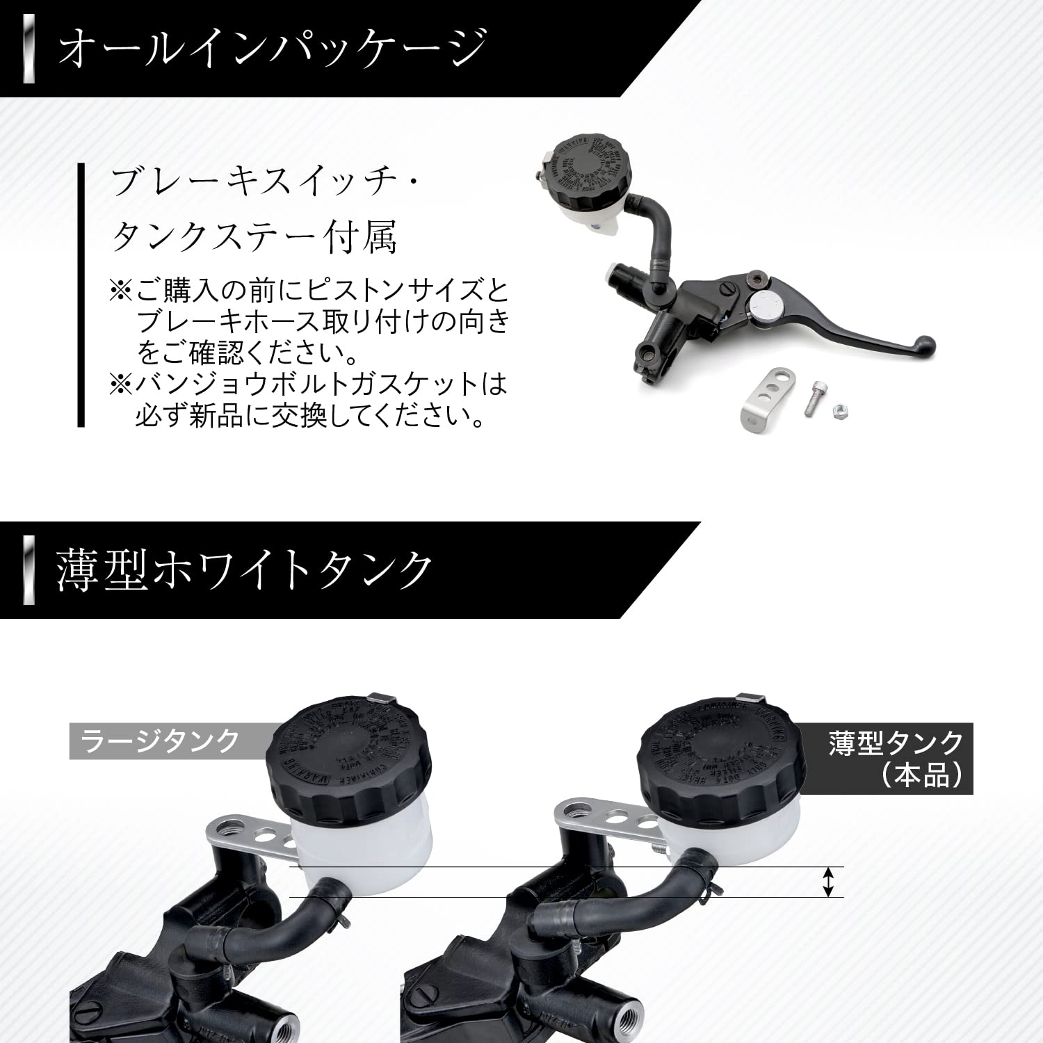 ●タンクステー、ブレーキスイッチも付属した安心のボルトオン設計。ノーマル車両のマスターシリンダーピストン径やカラーに合わせて選べる幅広いラインアップが魅力。