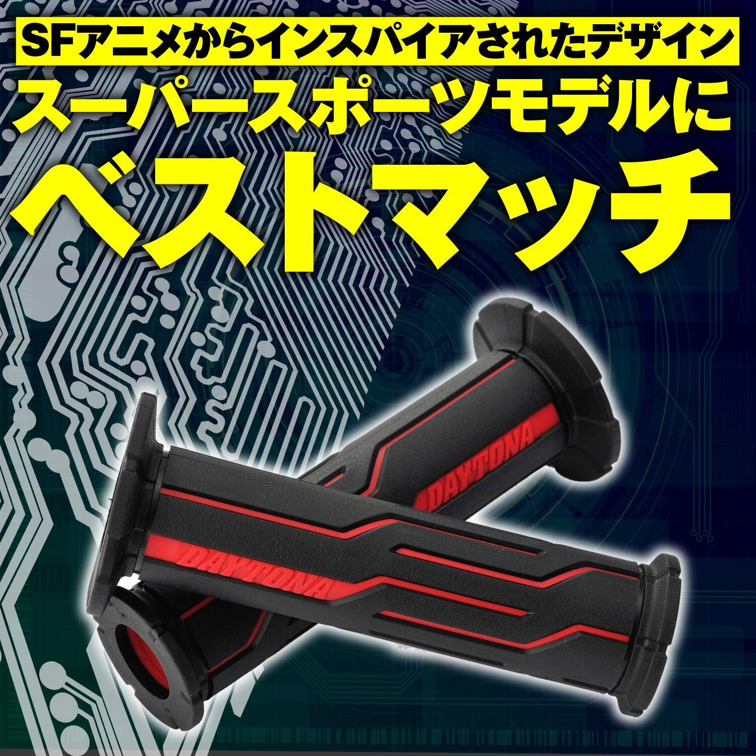 エルゴノミクス(人間工学)デザインを採り入れたデイトナオリジナルグリップ。グリップ力に優れるやわらかな素材を外側、硬めの素材を内側に組み合わせた2層構造により、長時間のライディングでも疲れません。SFアニメからインスパイアされたデザインは、エッジの効いた現在のスーパースポーツモデルにベストマッチ。