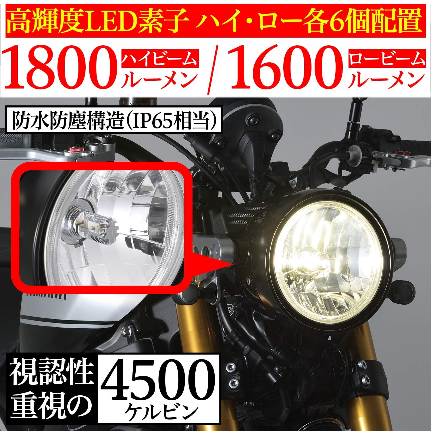 見やすさを優先させたバイク用4500ケルビンLEDヘッドランプ。高輝度LED素子をハイ/ロービーム各6個配置。明るさはハイ1800ルーメン/ロービーム1600ルーメンで、ハイロー切り替えも瞬時に切り替え可能です。アルミ製クロームメッキボディに、電動冷却ファンをバルブフランジ前方に配置。ハロゲンバルブと同等寸法だから、取付場所や配線の取り回しに悩むことはありません。