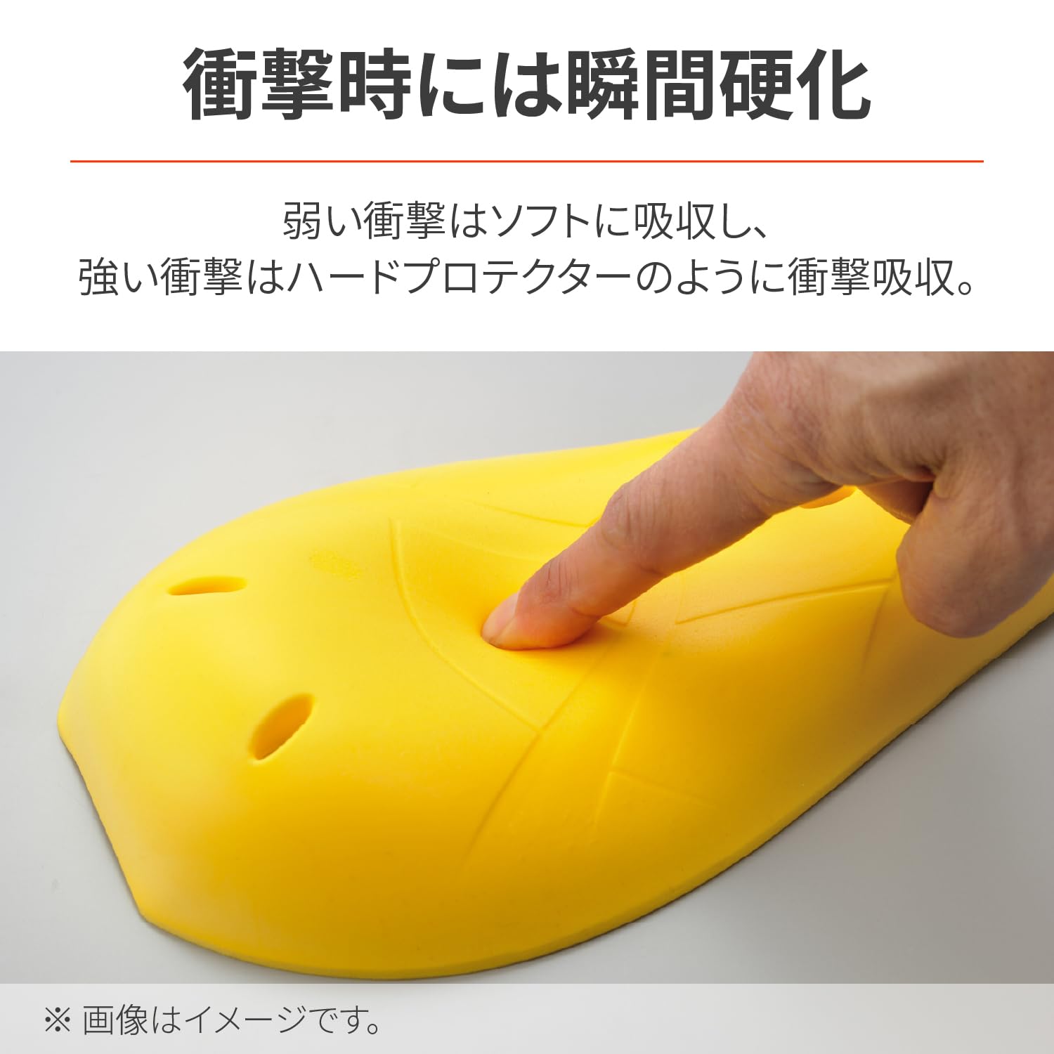 【仕様1】粘弾性ビスコエラスティックを採用することで、普段はソフトな装着感ながら、弱い衝撃時はソフトに吸収、強い衝撃時に対しては硬く吸収します