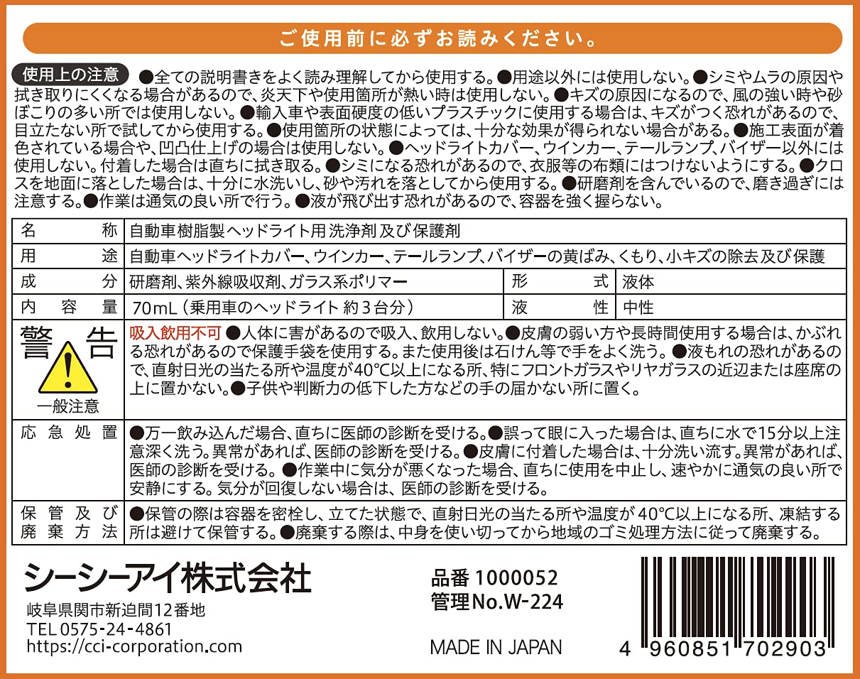 CCI 車用 ヘッドライトクリーナー&コート剤 スマートシャイン レギュラー70ml W-224