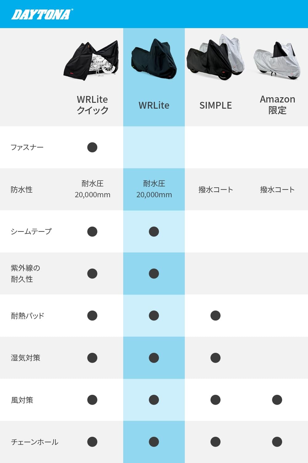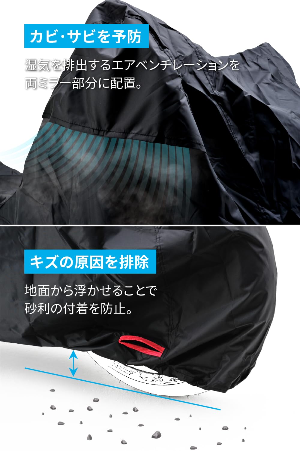 【仕様4】中央のベルトと後部の絞りひもでバタつき防止、前後大型チェーンロック対応ホール装備、ミラー部湿気防止ダクト装備、収納袋付属