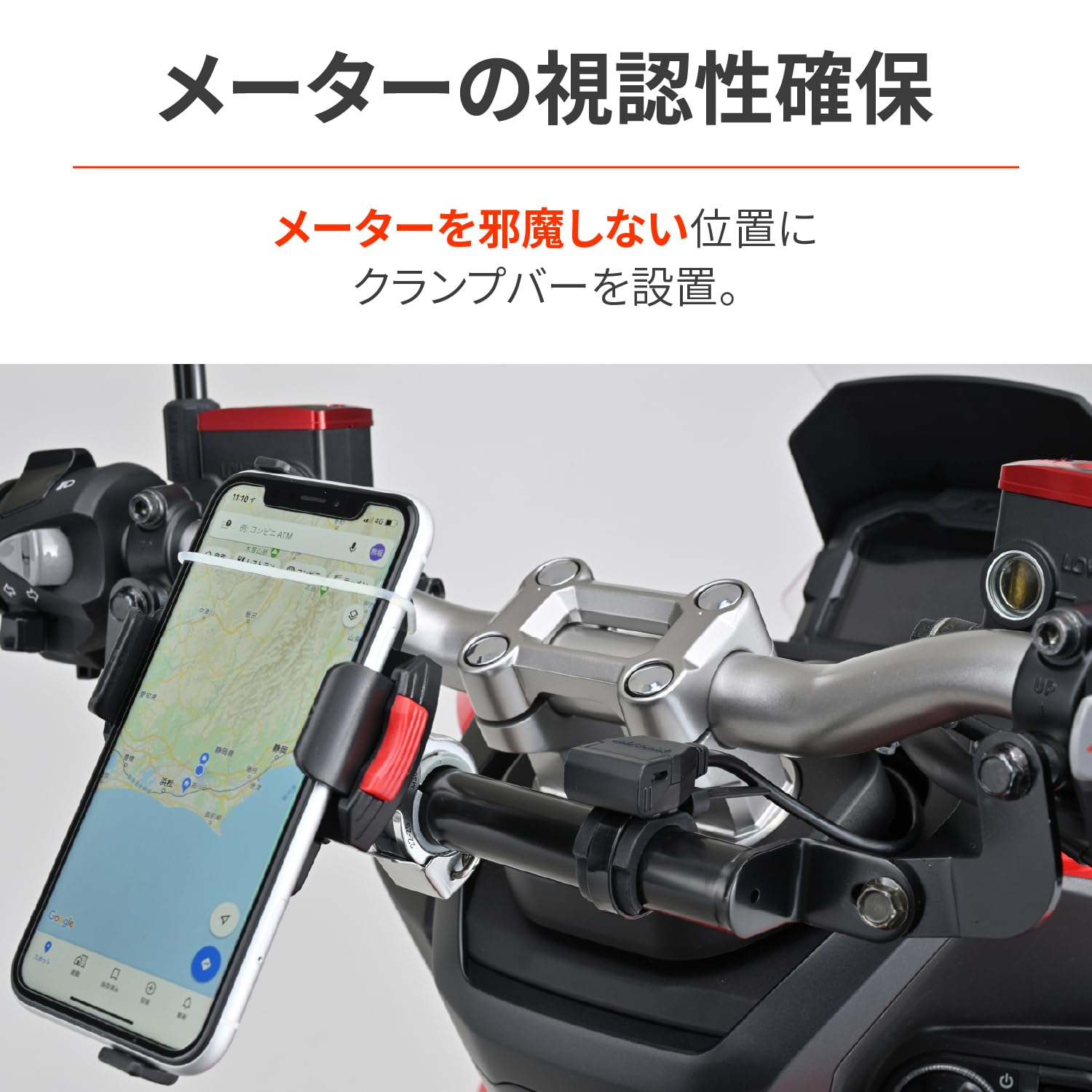 スマートフォンやUSB電源などの取り付けに便利なクランプバー。