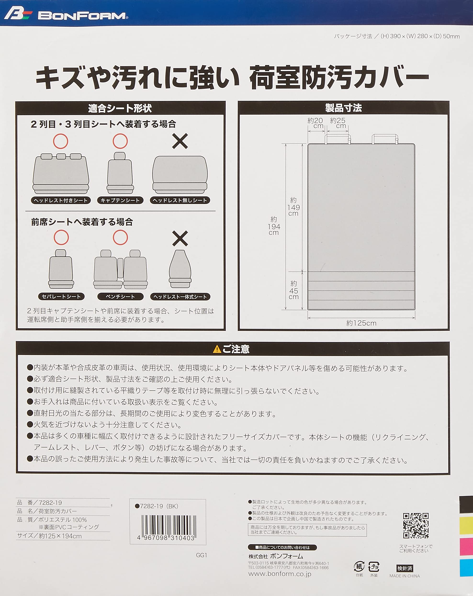 ボンフォーム(BONFORM) ラゲッジマット 荷室防汚カバー 軽/普通車 荷室カバー 125x194cm ブラック 7282-19BK
